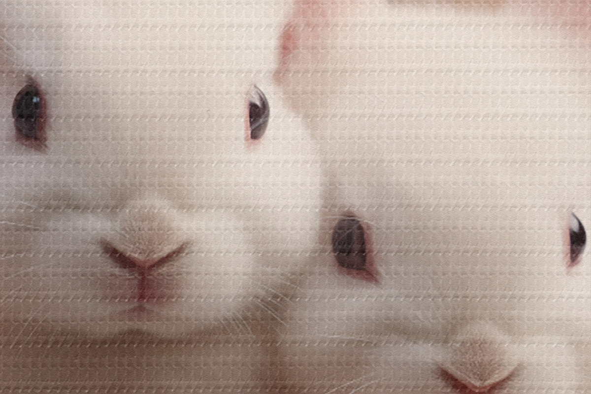 Immagine Due conigli bianchi tra delicati fiori di rosa Nr r44380