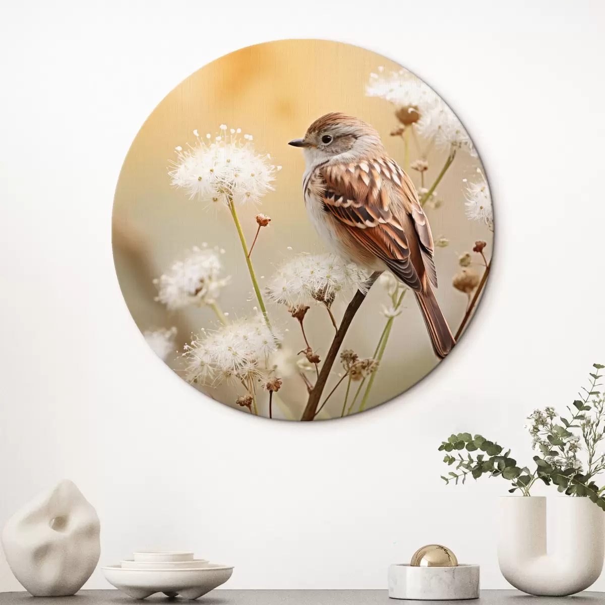 Quadri rotondi Uccello appollaiato su un ramo con fiori bianchi, soft focus, sfondo naturale r44393