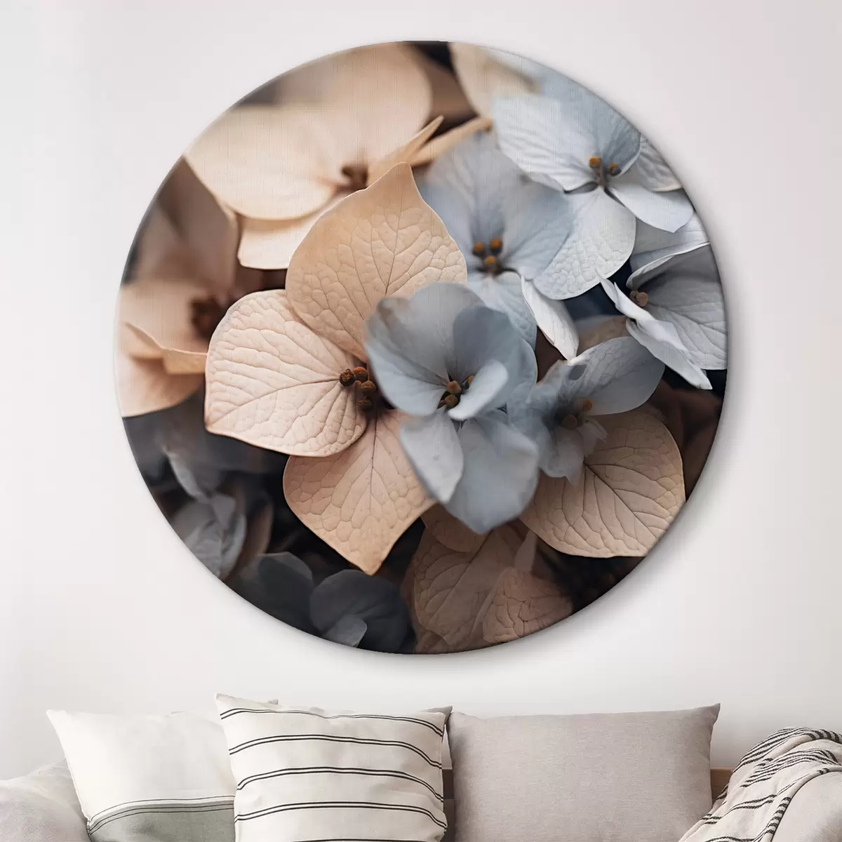Quadri rotondi Fiori di ortensia, petali azzurri e beige, con texture dettagliate, composizione floreale elegante r44394