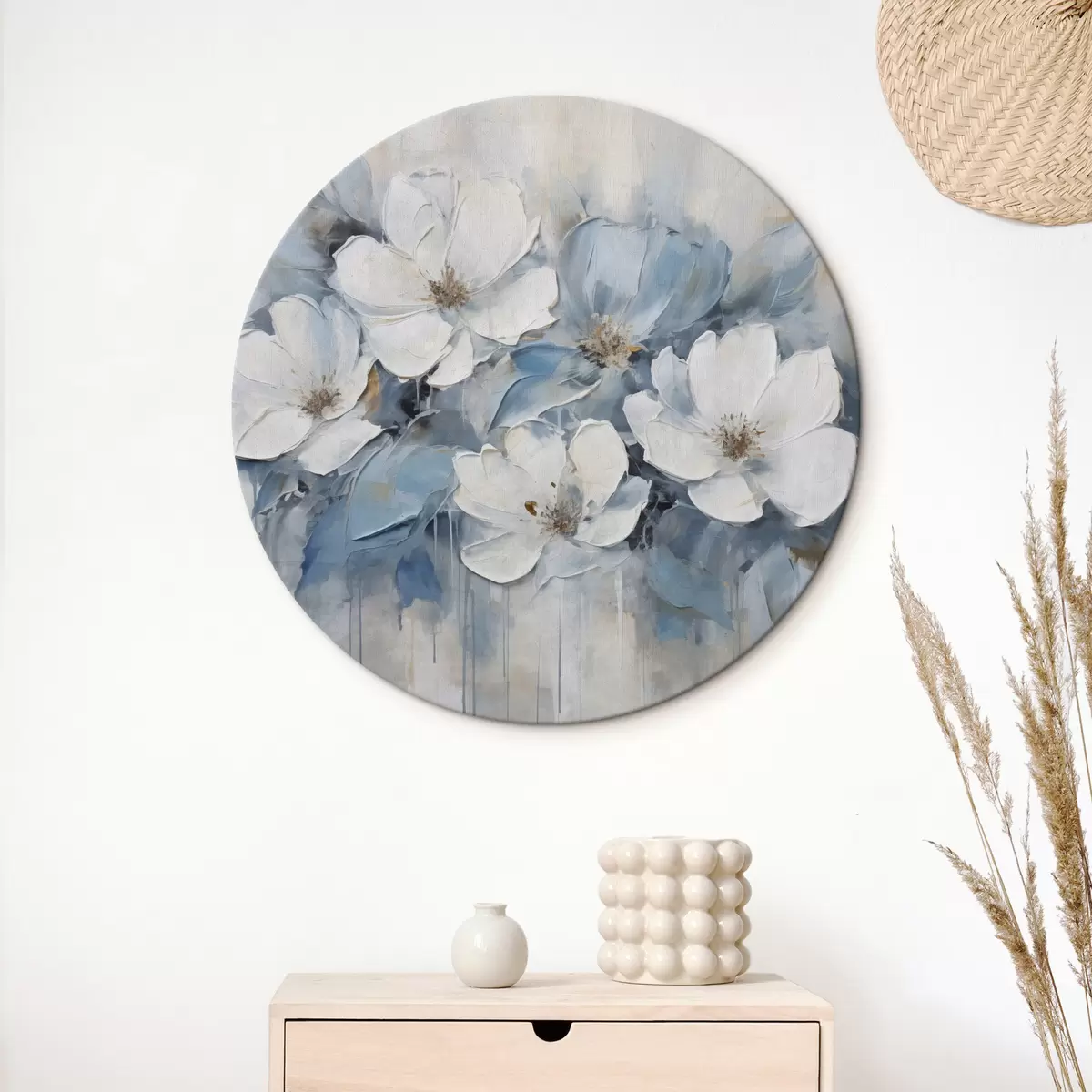 Quadri rotondi Fiori bianchi con foglie blu, su sfondo beige chiaro, con pennellate visibili r44395