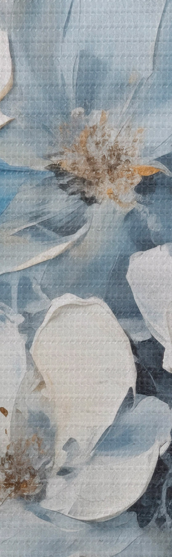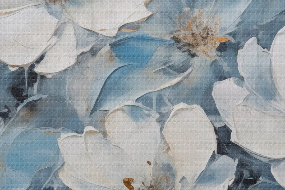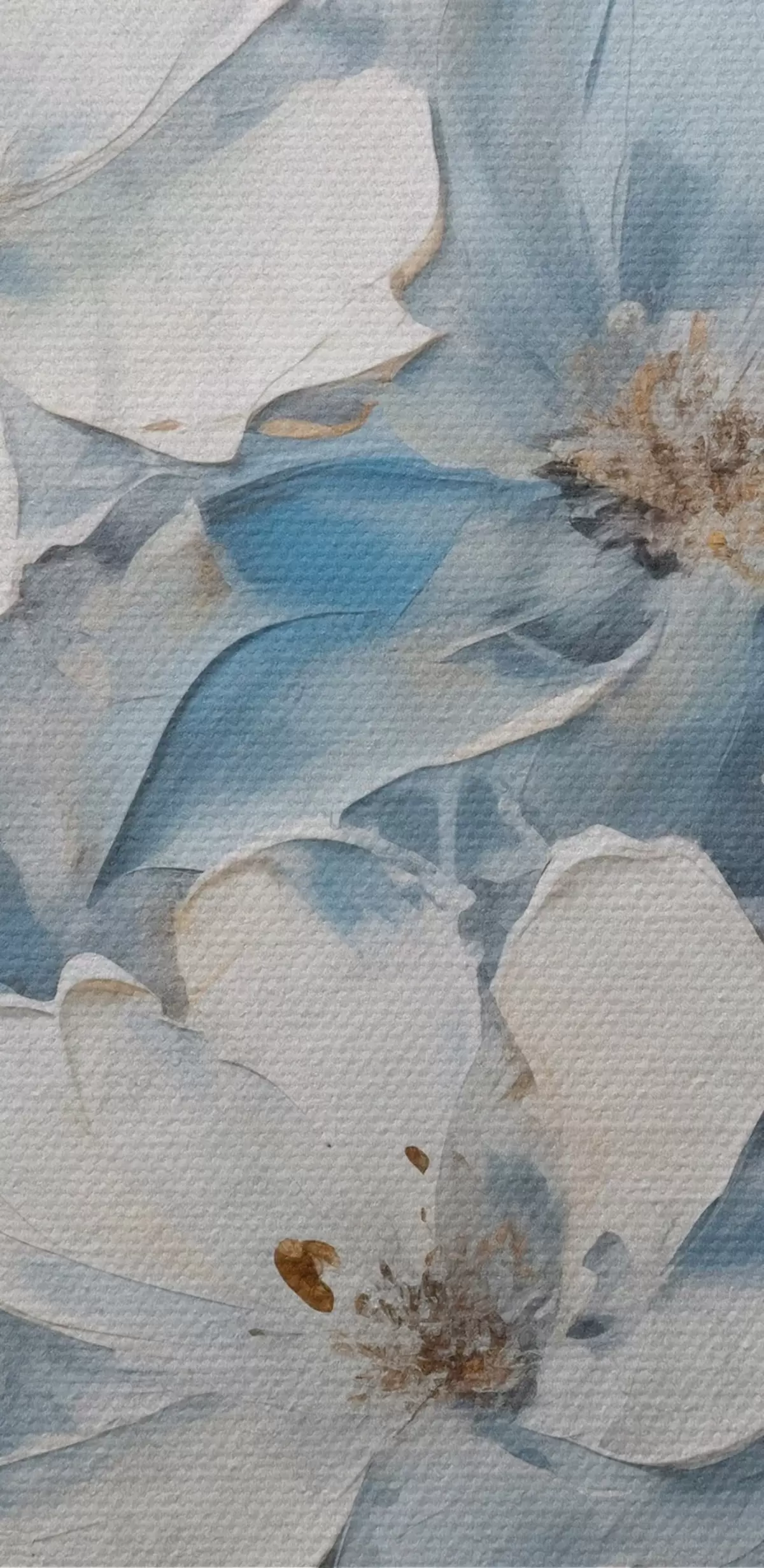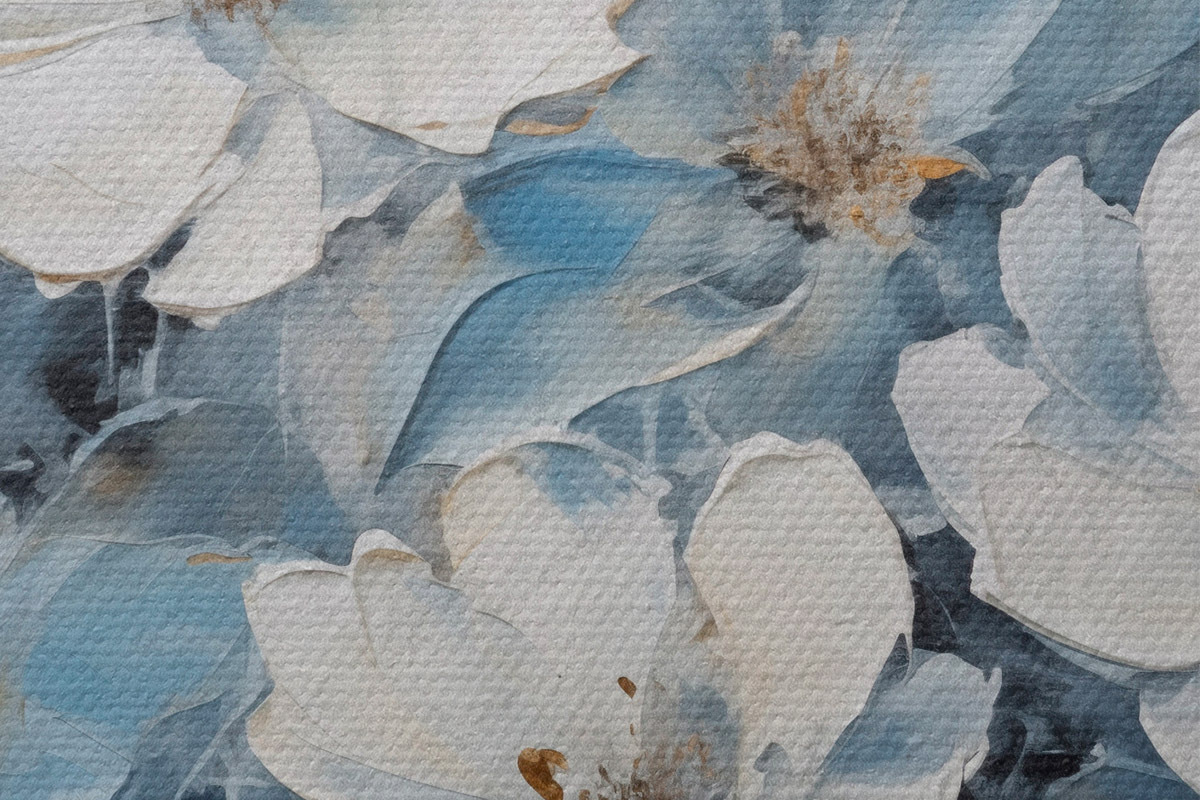 Immagine Fiori bianchi con foglie blu, su sfondo beige chiaro, con pennellate visibili Nr r44395