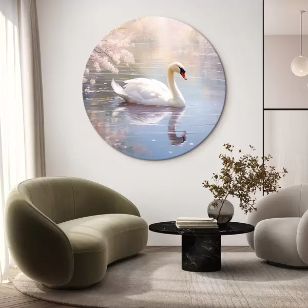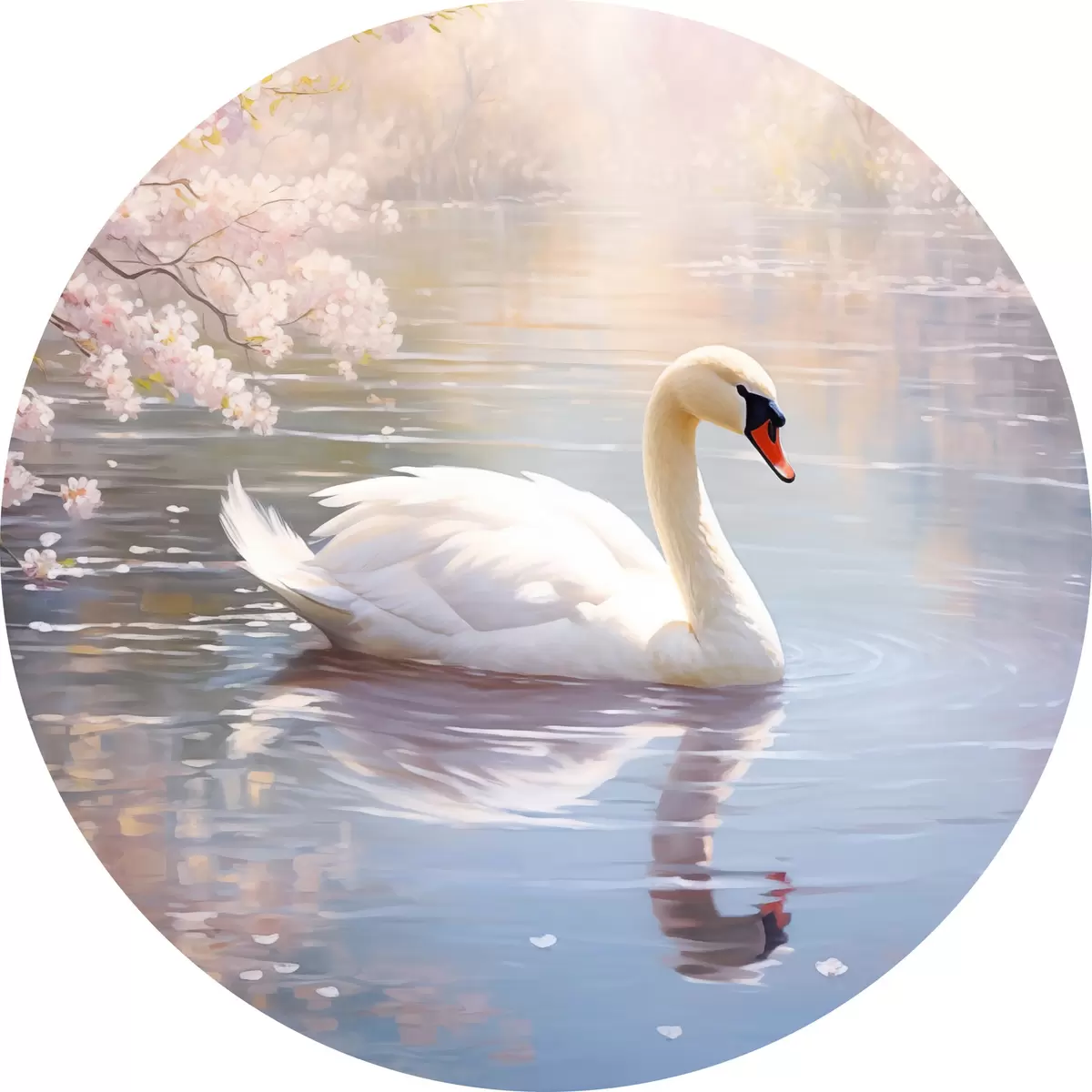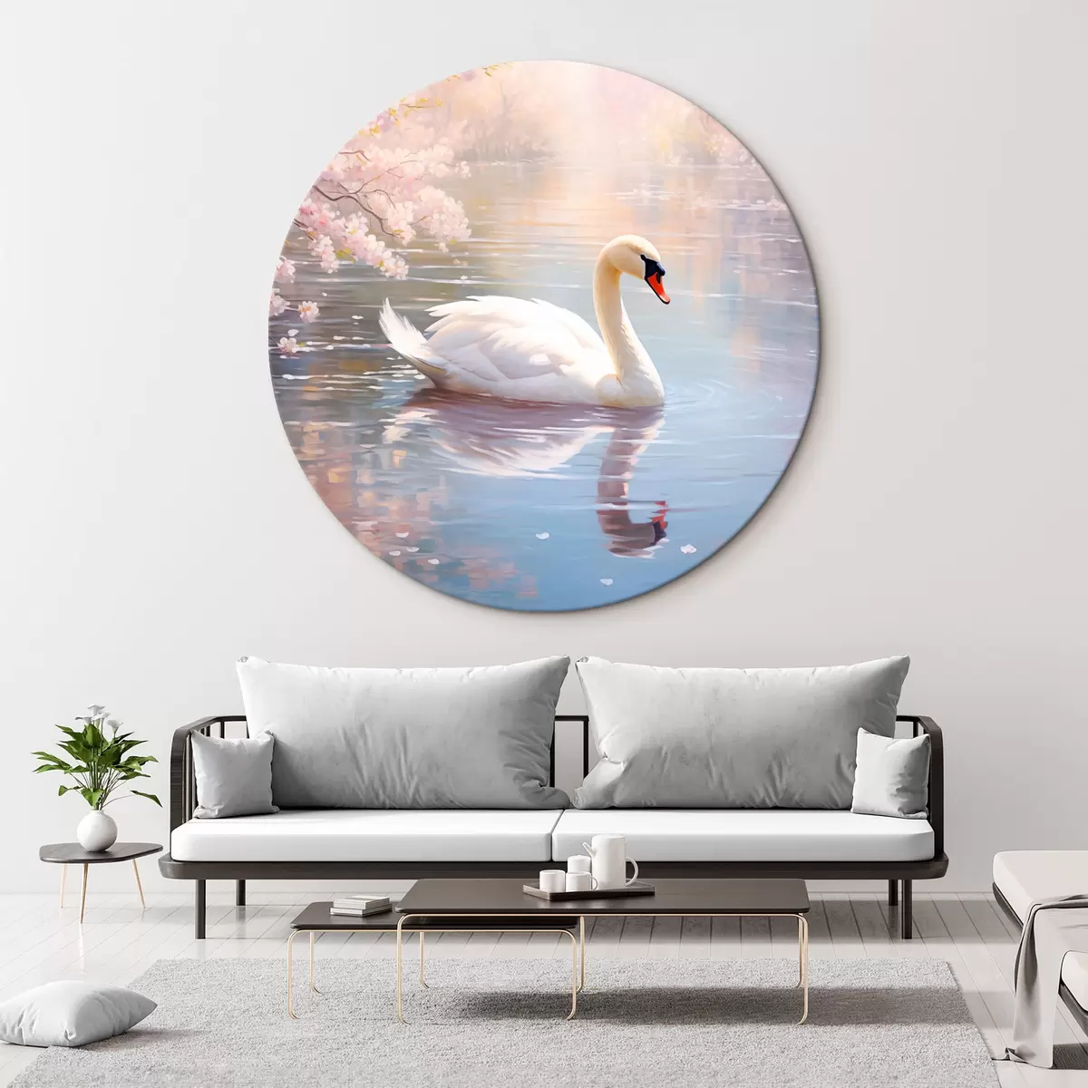 Quadri rotondi Un cigno bianco che nuota in un lago con alberi di ciliegio in fiore, colori pastello r44396