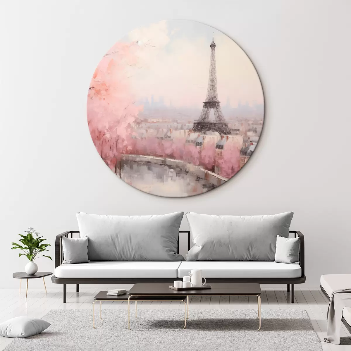 Quadri rotondi Torre Eiffel a Parigi con alberi di ciliegio in fiore in primavera, colori pastello tenui r44398