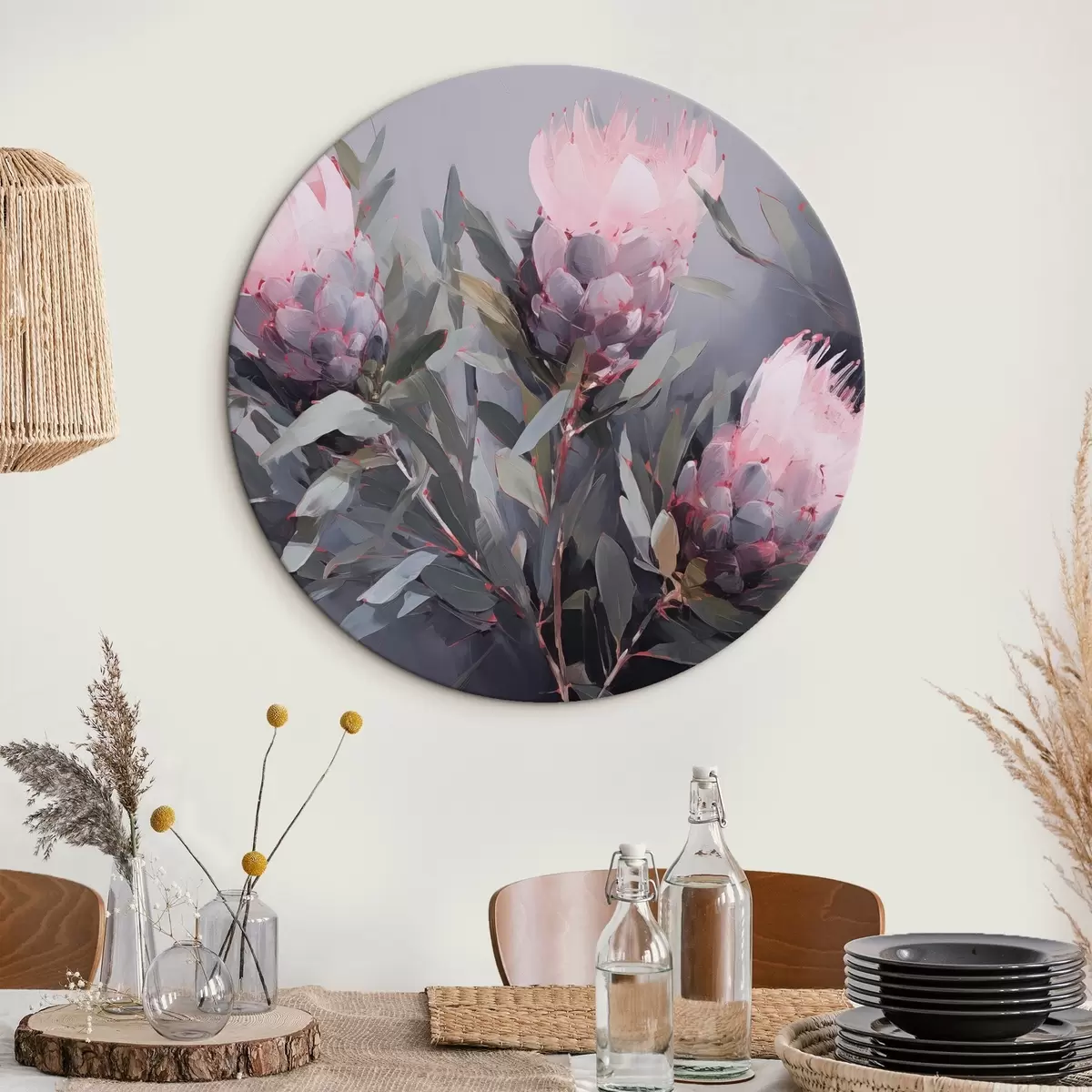 Quadri rotondi Fiori di protea rosa con foglie verdi, pennellate morbide, colori scuri, composizione elegante r44400