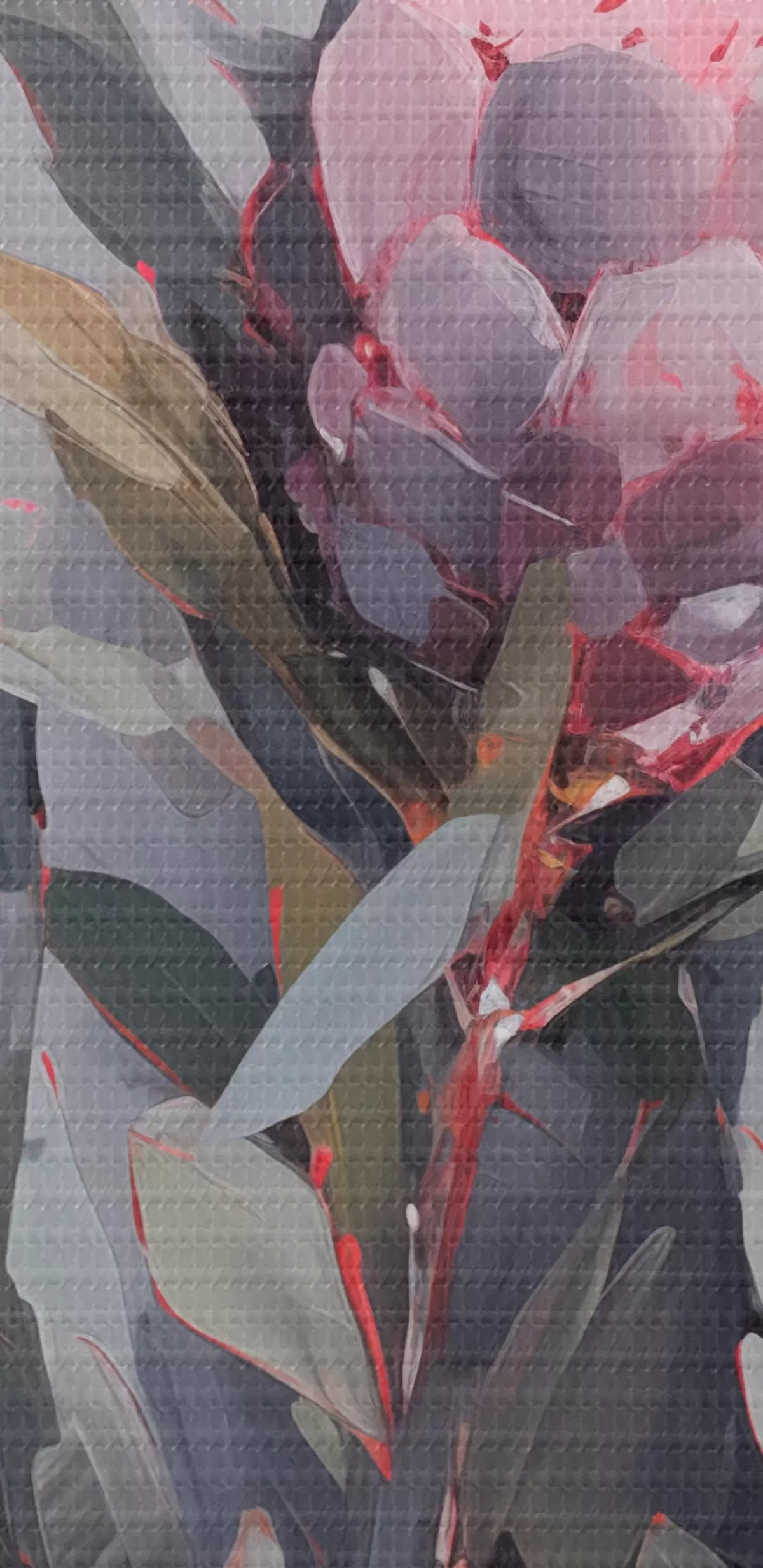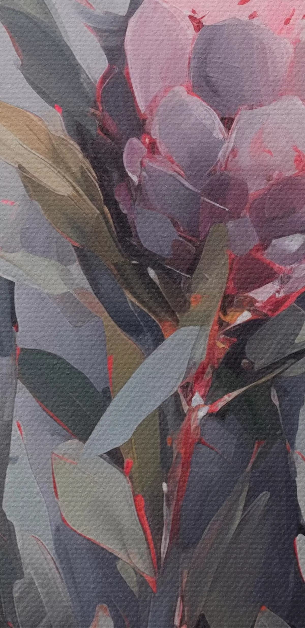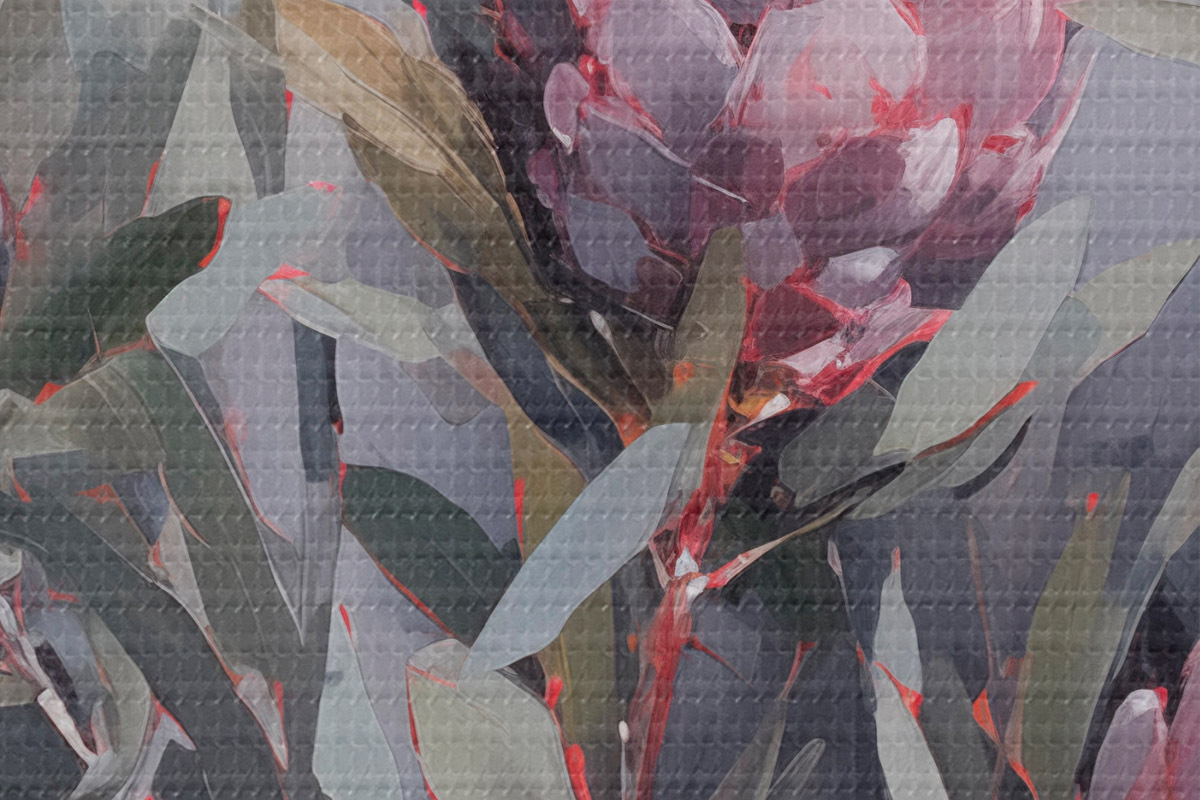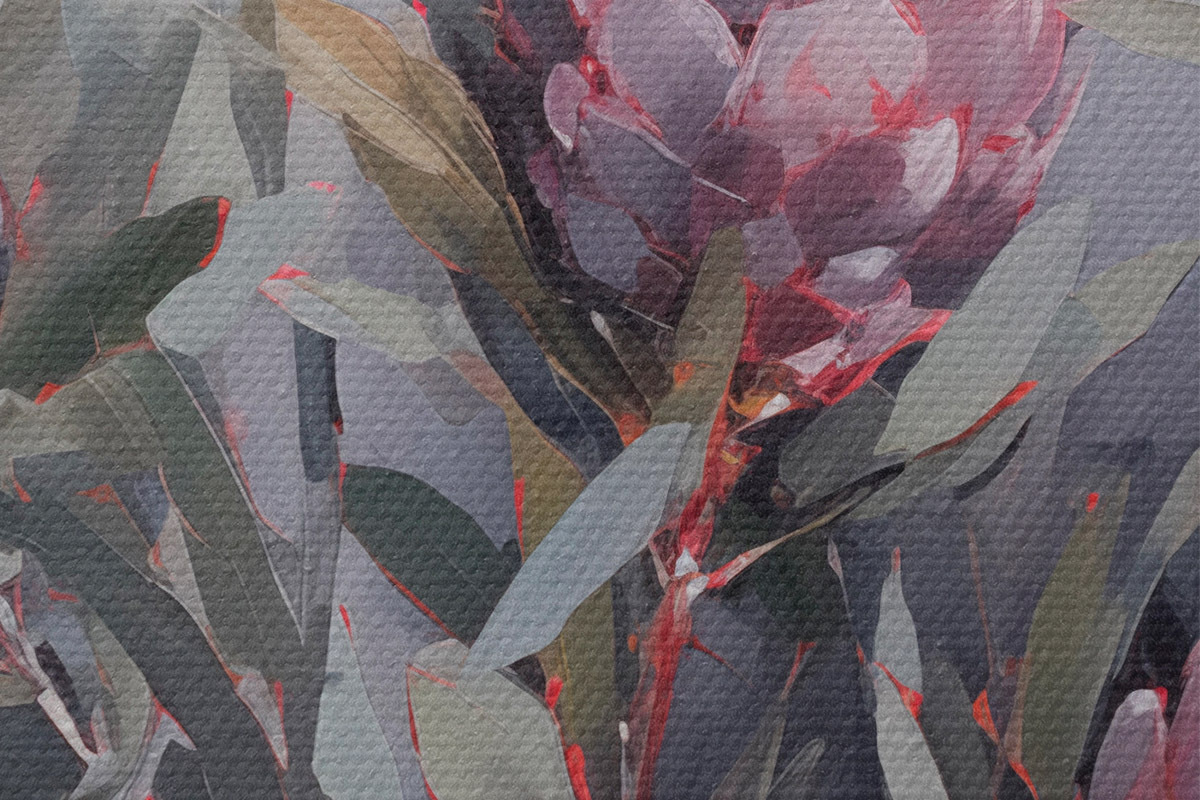 Immagine Fiori di protea rosa con foglie verdi, pennellate morbide, colori scuri, composizione elegante Nr r44400
