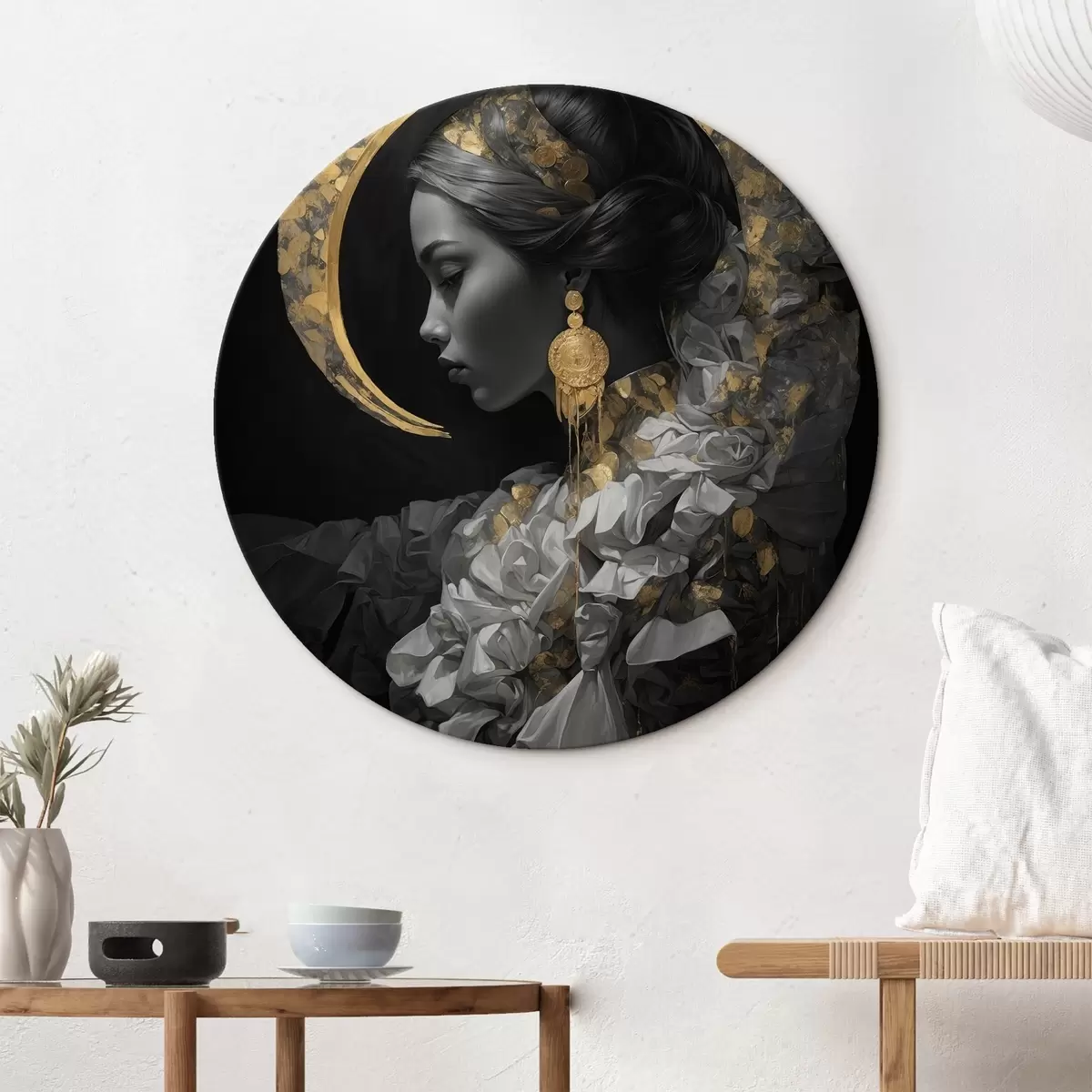 Quadri rotondi Ragazza e luna crescente gialla su sfondo nero r44449