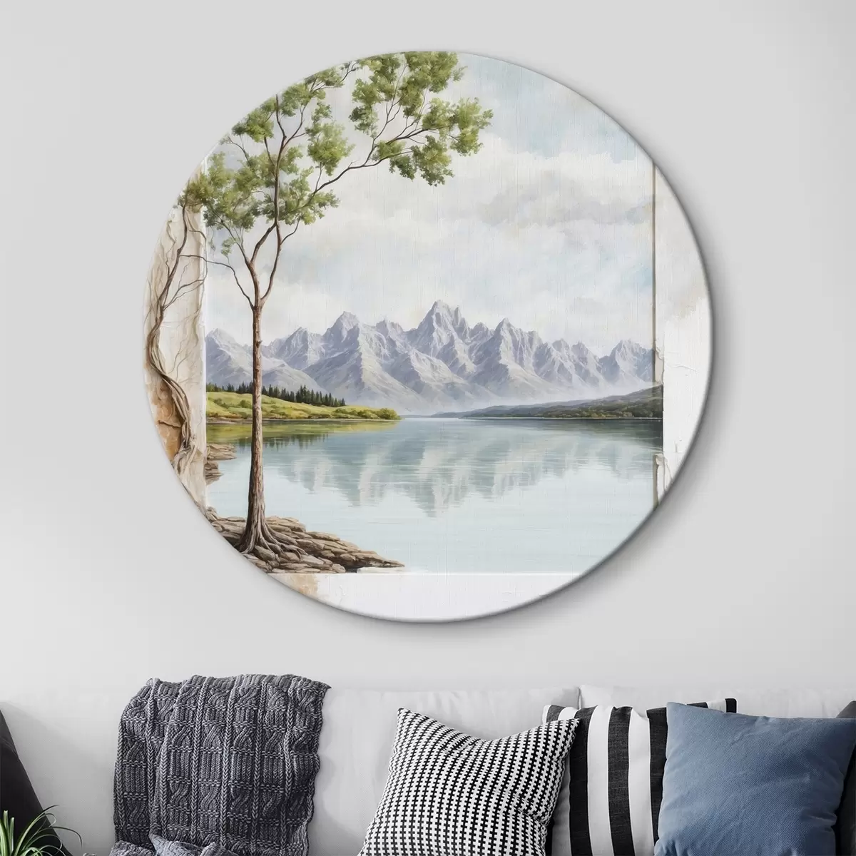 Quadri rotondi Vista sul lago e montagne innevate nell'inquadratura r44458