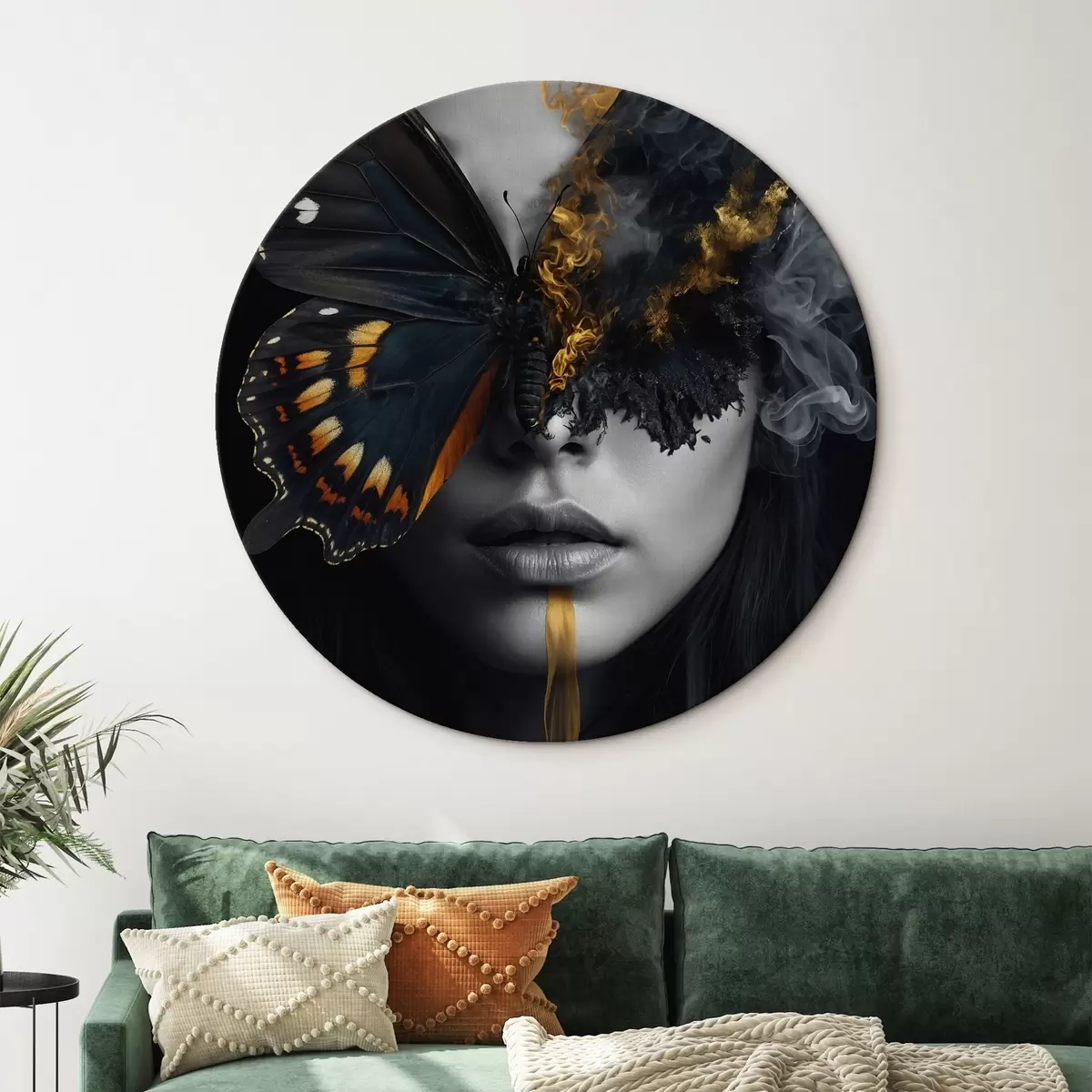 Quadri rotondi Farfalla infuocata sul viso di una ragazza r44468