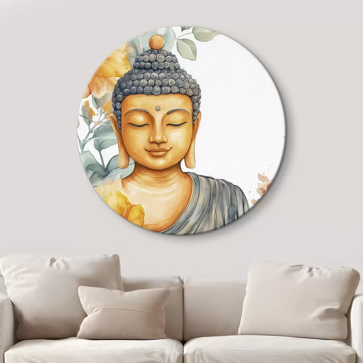 Quadri rotondi Buddha circondato da fiori arancioni, stile acquerello r44508
