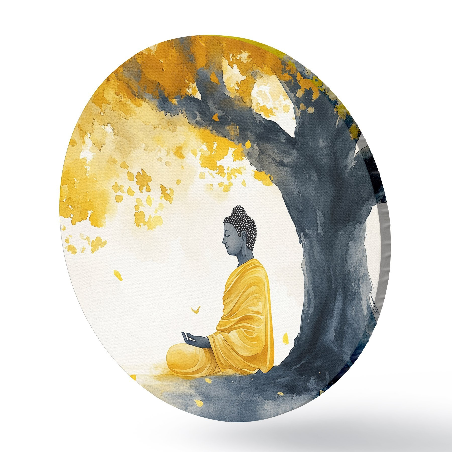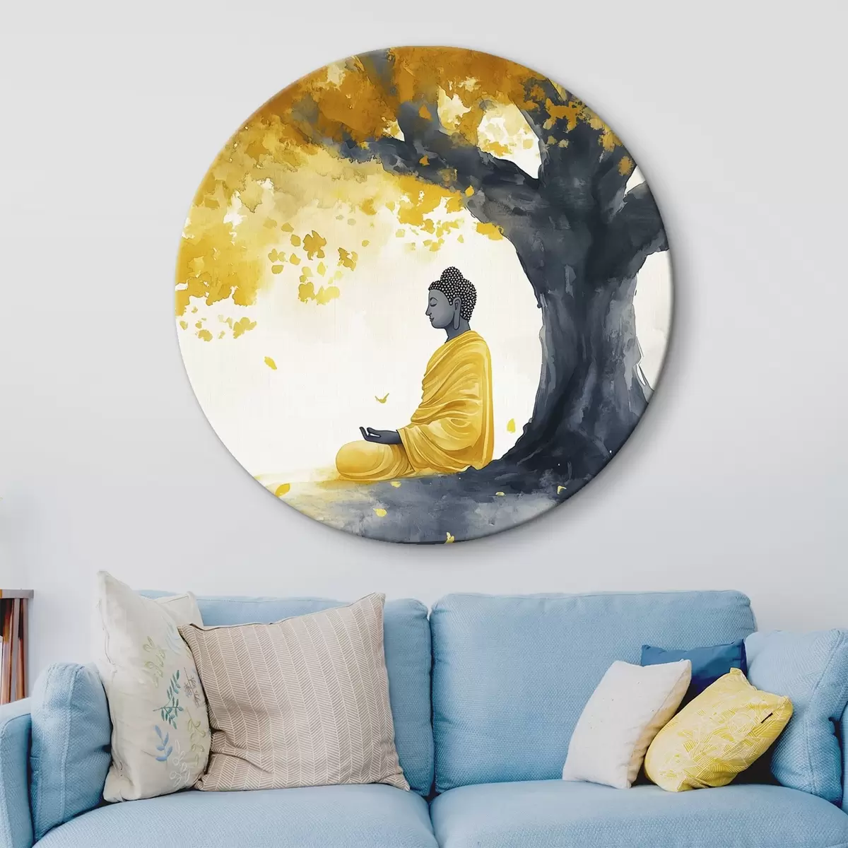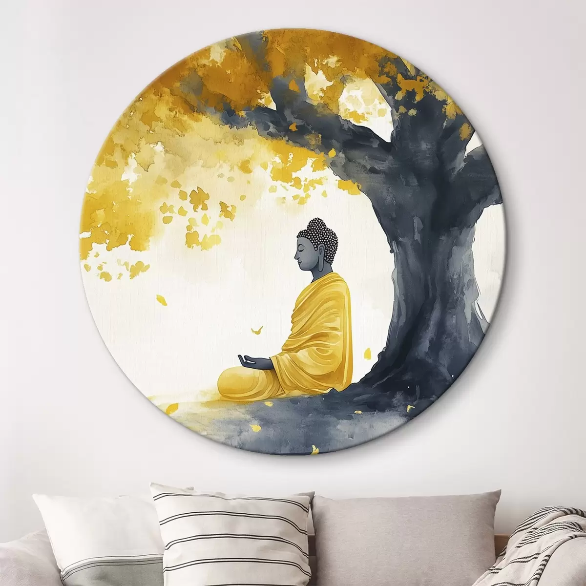 Quadri rotondi Buddha in meditazione sotto l'albero, colori giallo e grigio r44509
