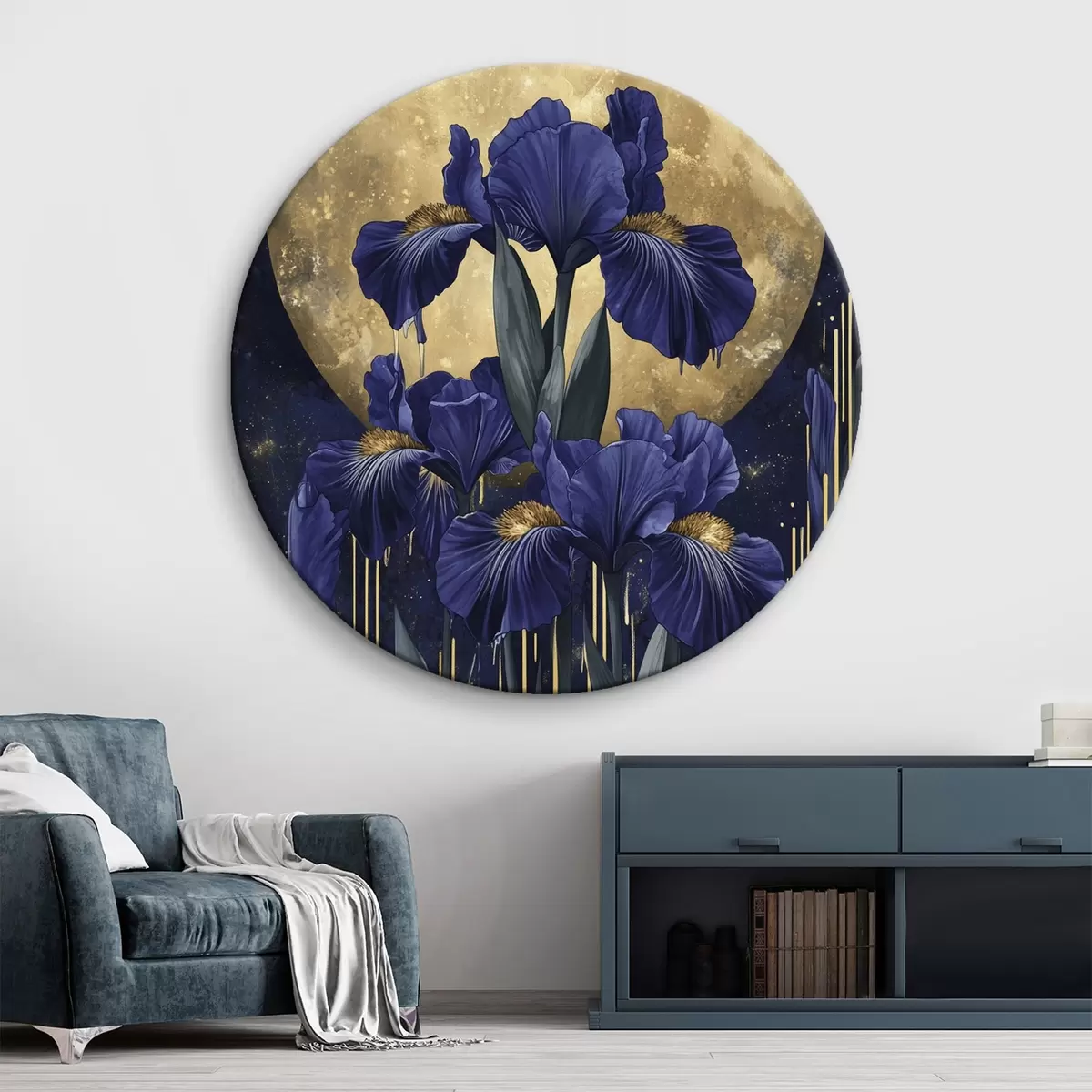 Quadri rotondi Fiori di iris, luna splendente, cielo notturno, colori blu r44510
