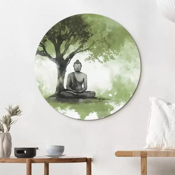 Quadri rotondi Buddha seduto sotto l'albero, meditazione, spirituale, colori verdi r44512v1