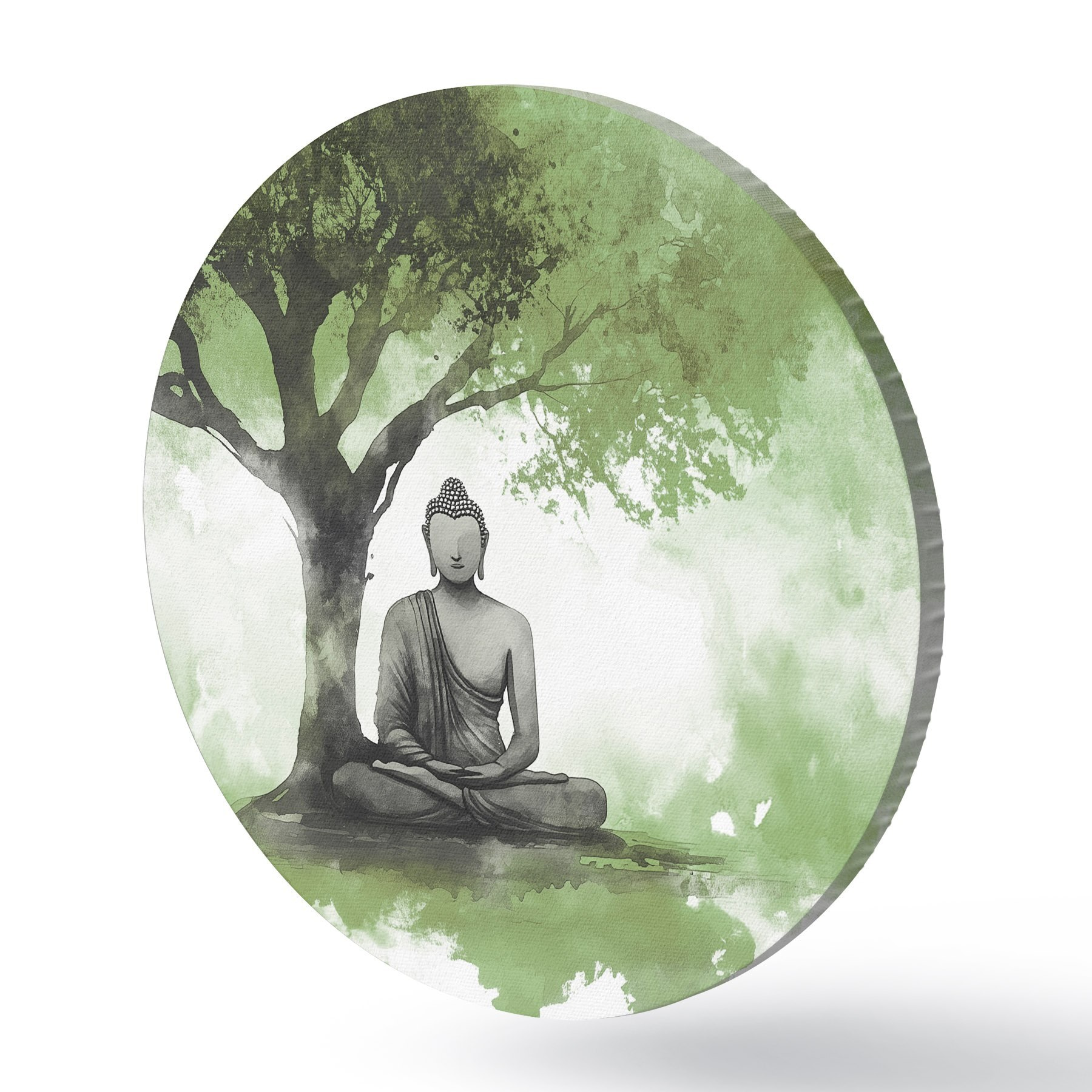Quadri rotondi Buddha seduto sotto l'albero, meditazione, spirituale, colori verdi r44512v1