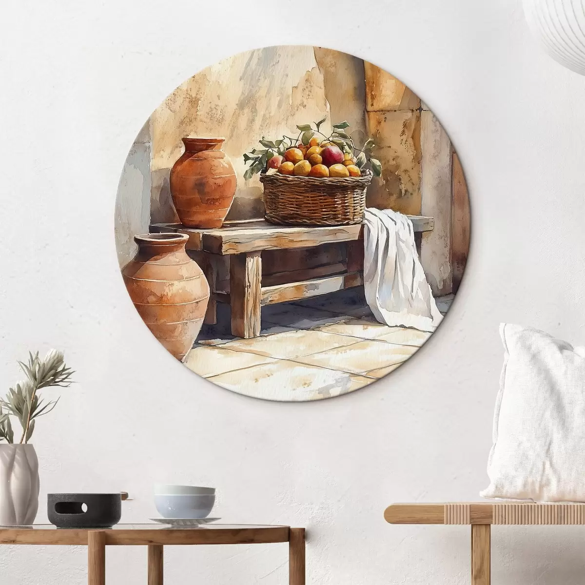 Quadri rotondi Vasi estetici e cesto di vimini con arance, Toscana, stile rustico r44605