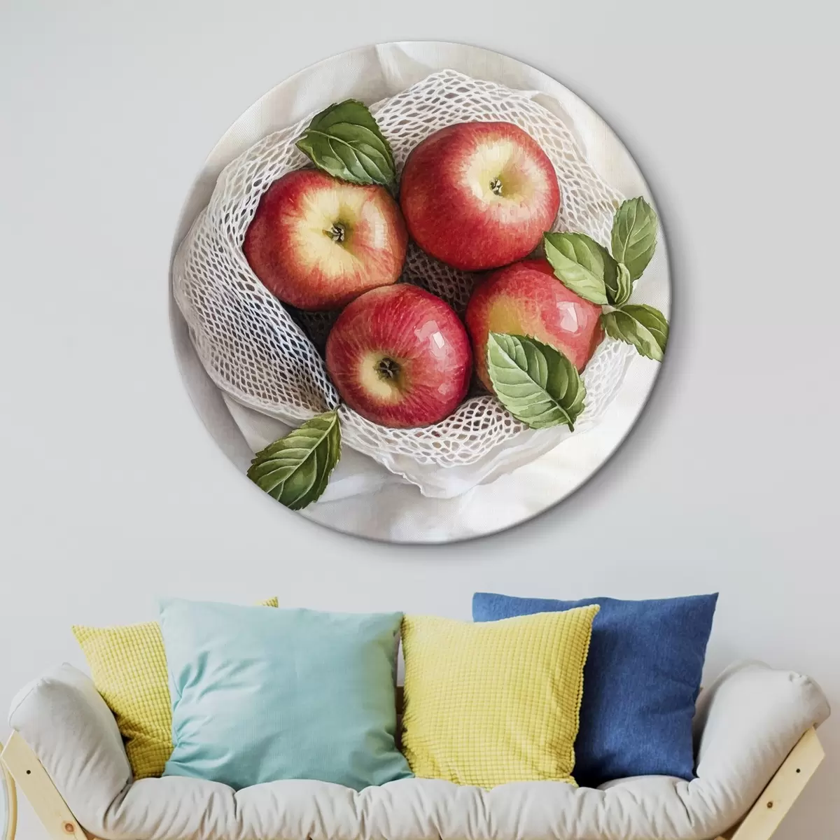Quadri rotondi Mele rosse nel sacchetto di lino con foglie di menta, stile rustico, frutta r44609