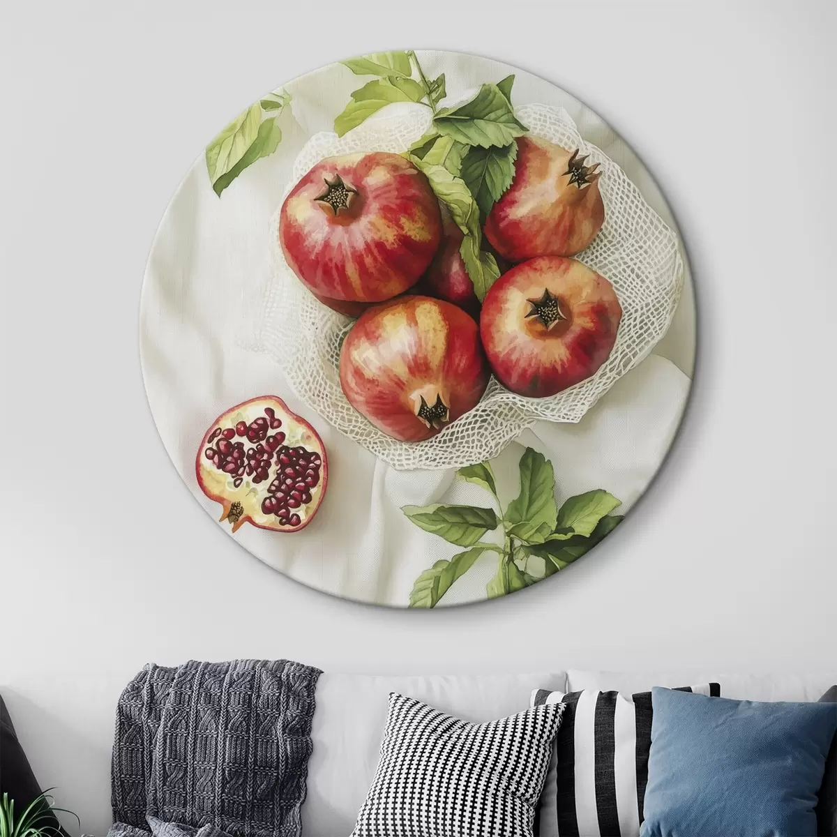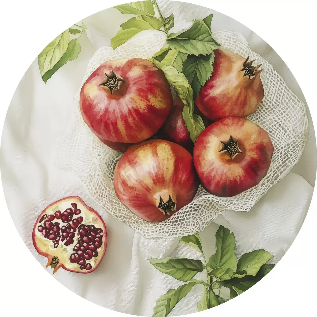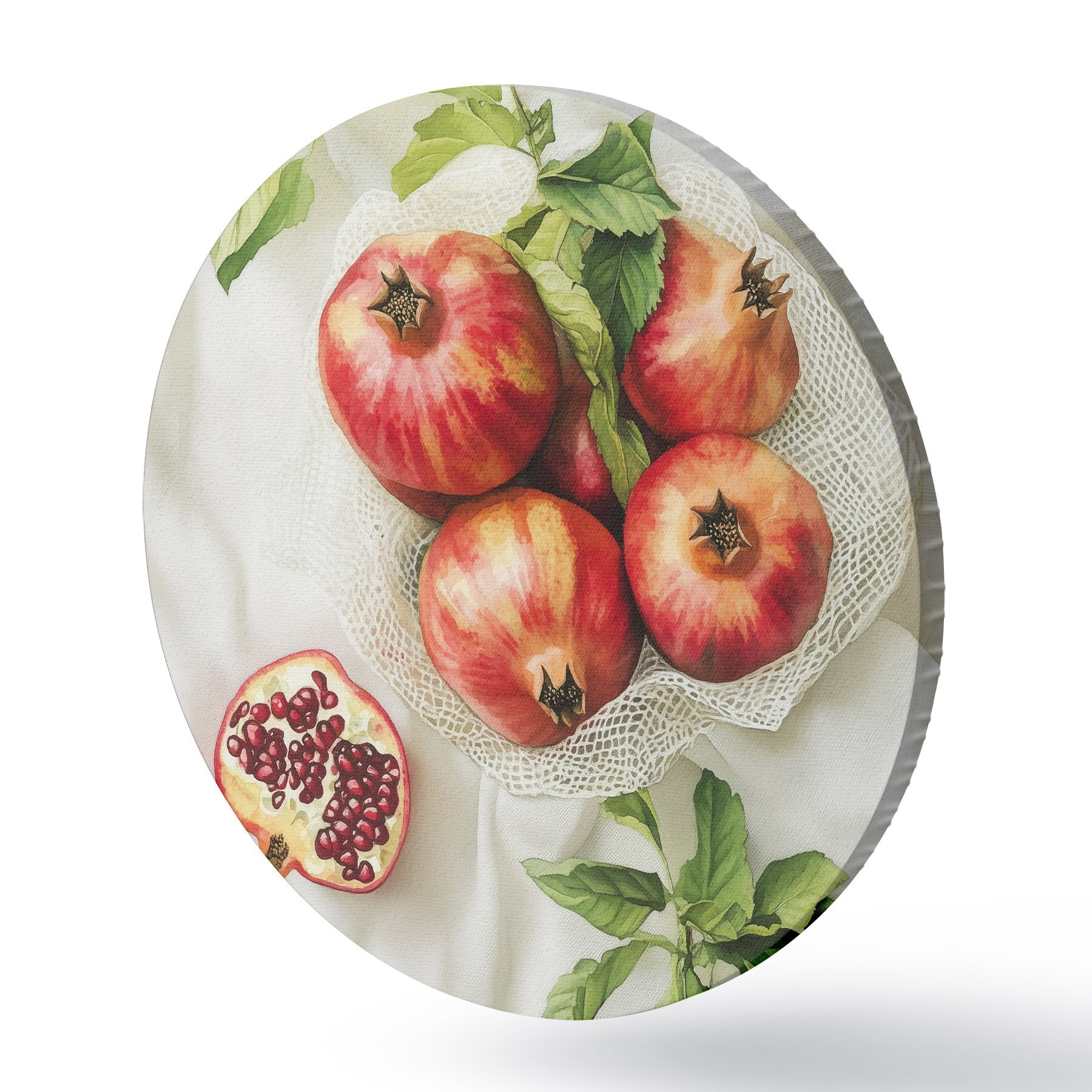 Quadri rotondi Melograni con foglie di menta sulle tovaglie di lino, stile rustico r44611