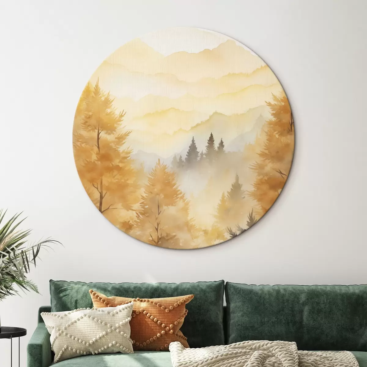 Quadri rotondi Bella foresta autunnale con montagne sullo sfondo r44614