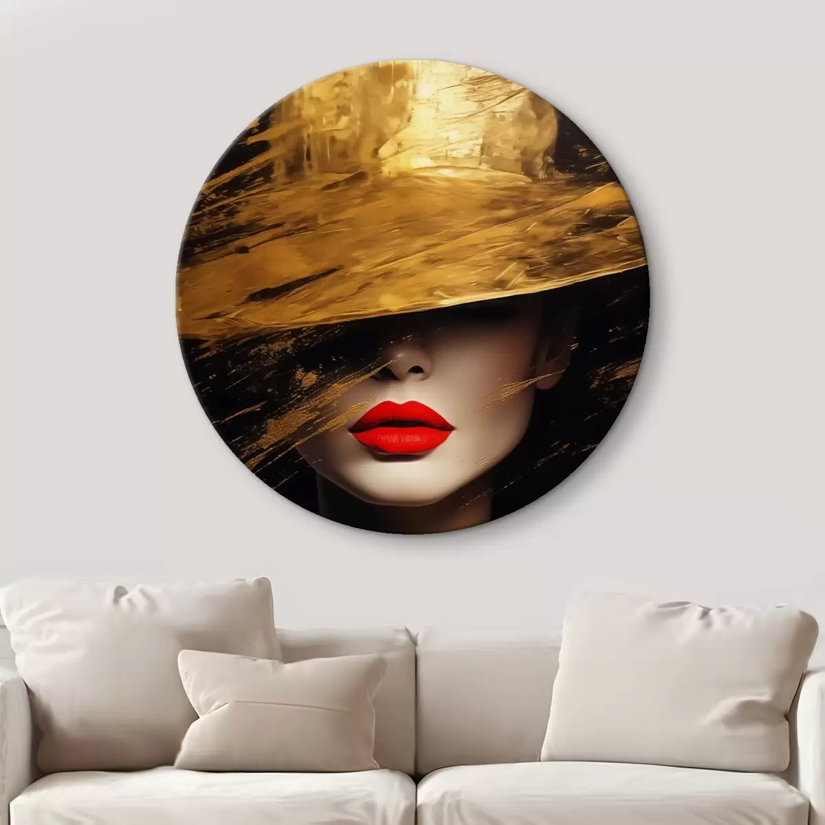 Quadri rotondi Volto femminile con rossetto rosso sotto un ampio cappello r44691