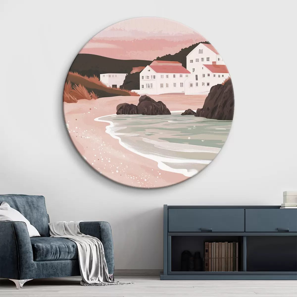 Quadri rotondi Accogliente spiaggia rosa con case bianche e conchiglie r44713