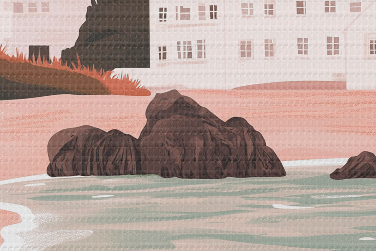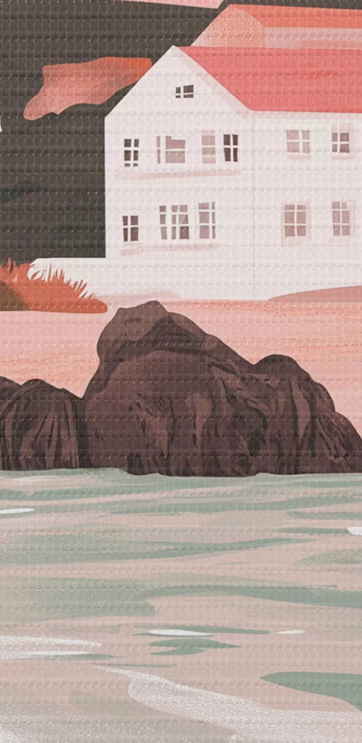 Immagine Accogliente spiaggia rosa con case bianche e conchiglie Nr r44713