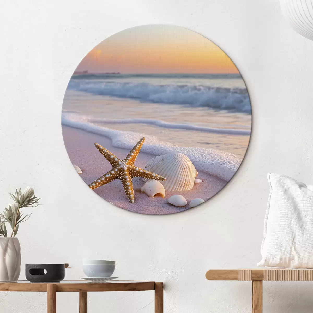 Quadri rotondi Costa marina con stelle marine, conchiglie e onde r44714