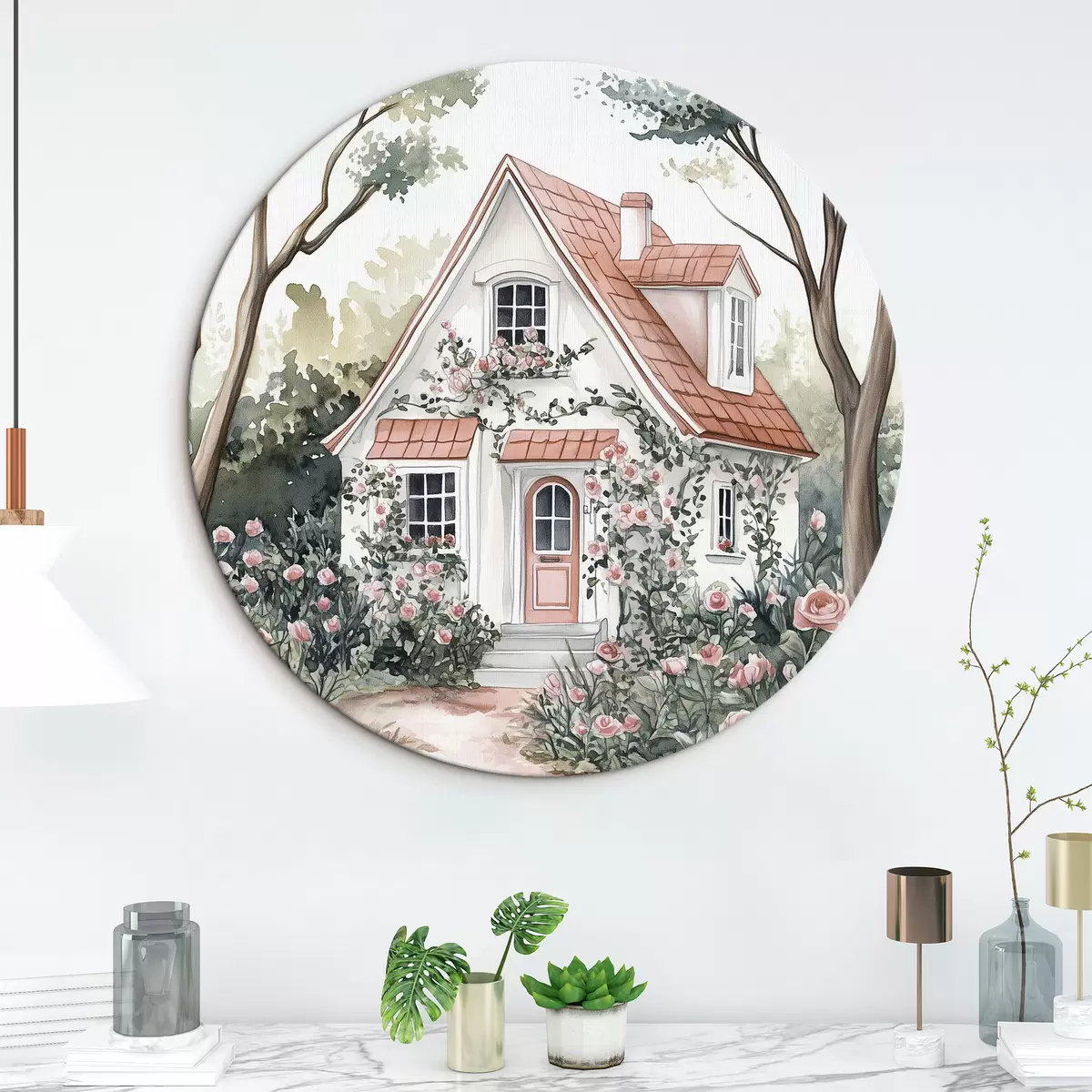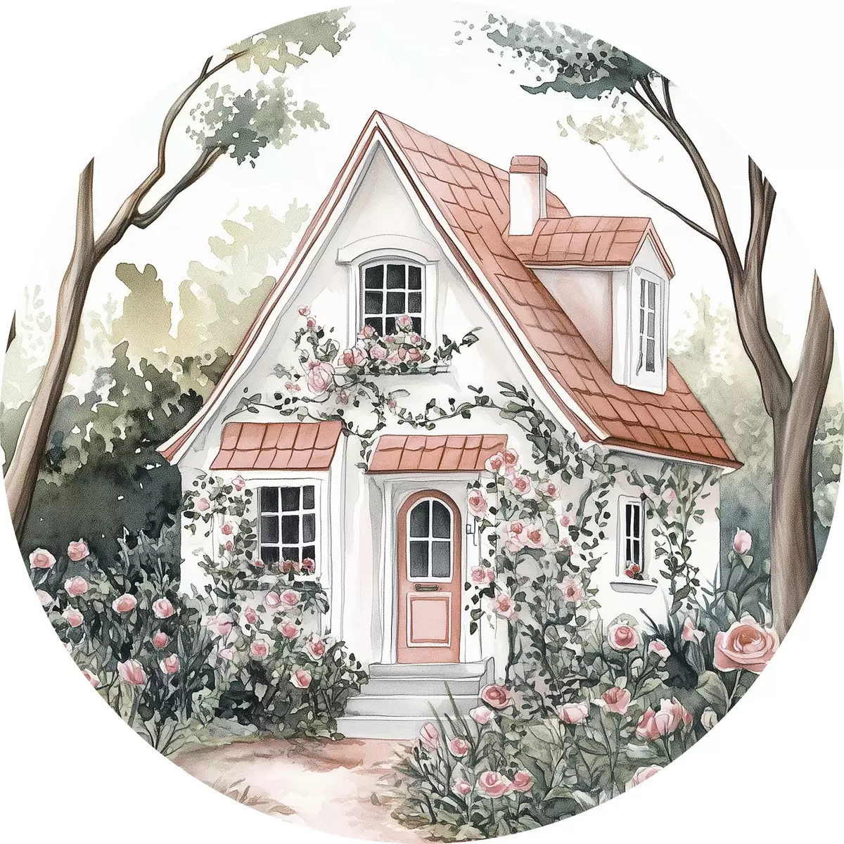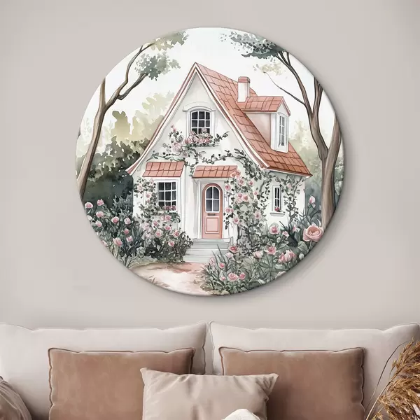 Quadri rotondi Casa bianca con giardino di rose nel bosco r44716