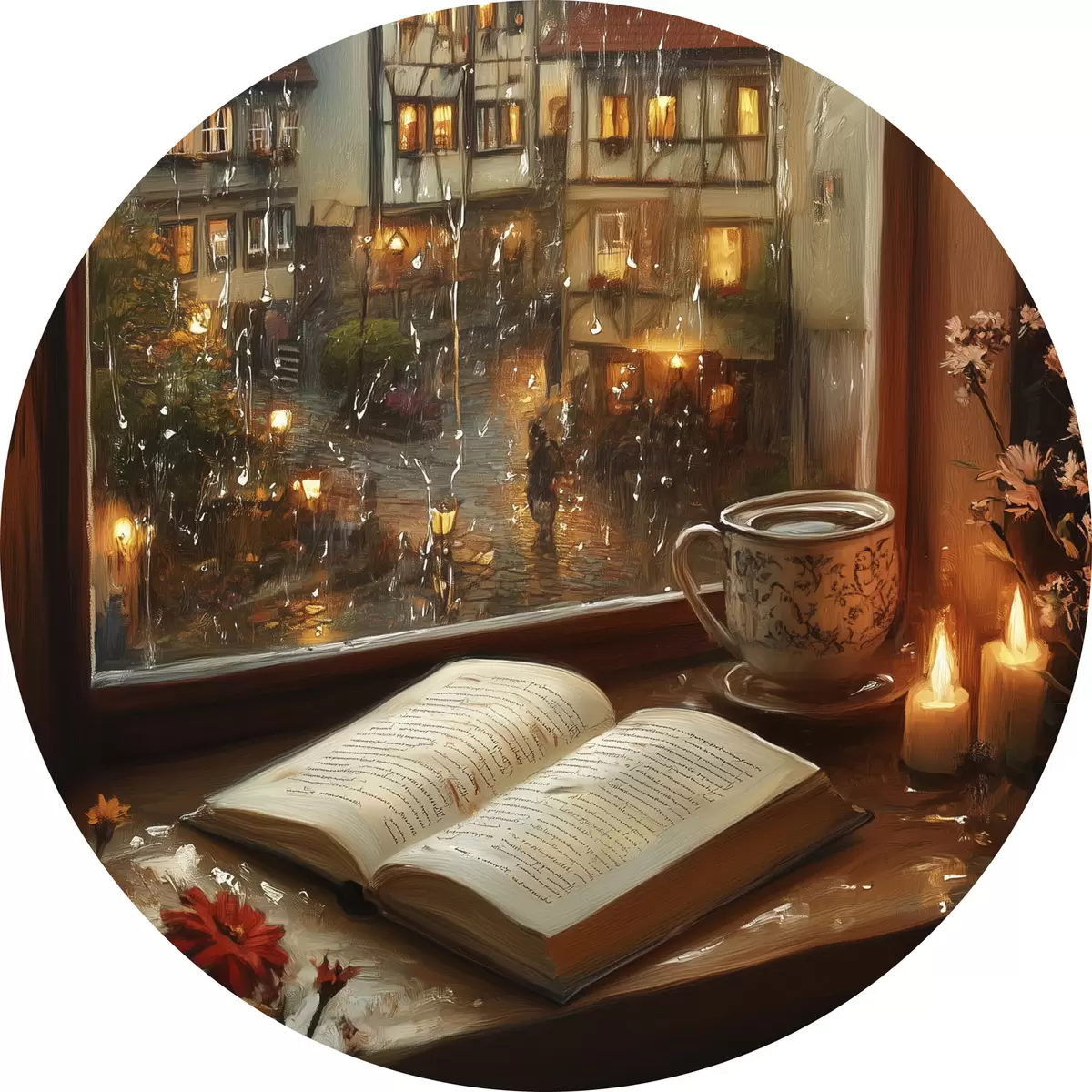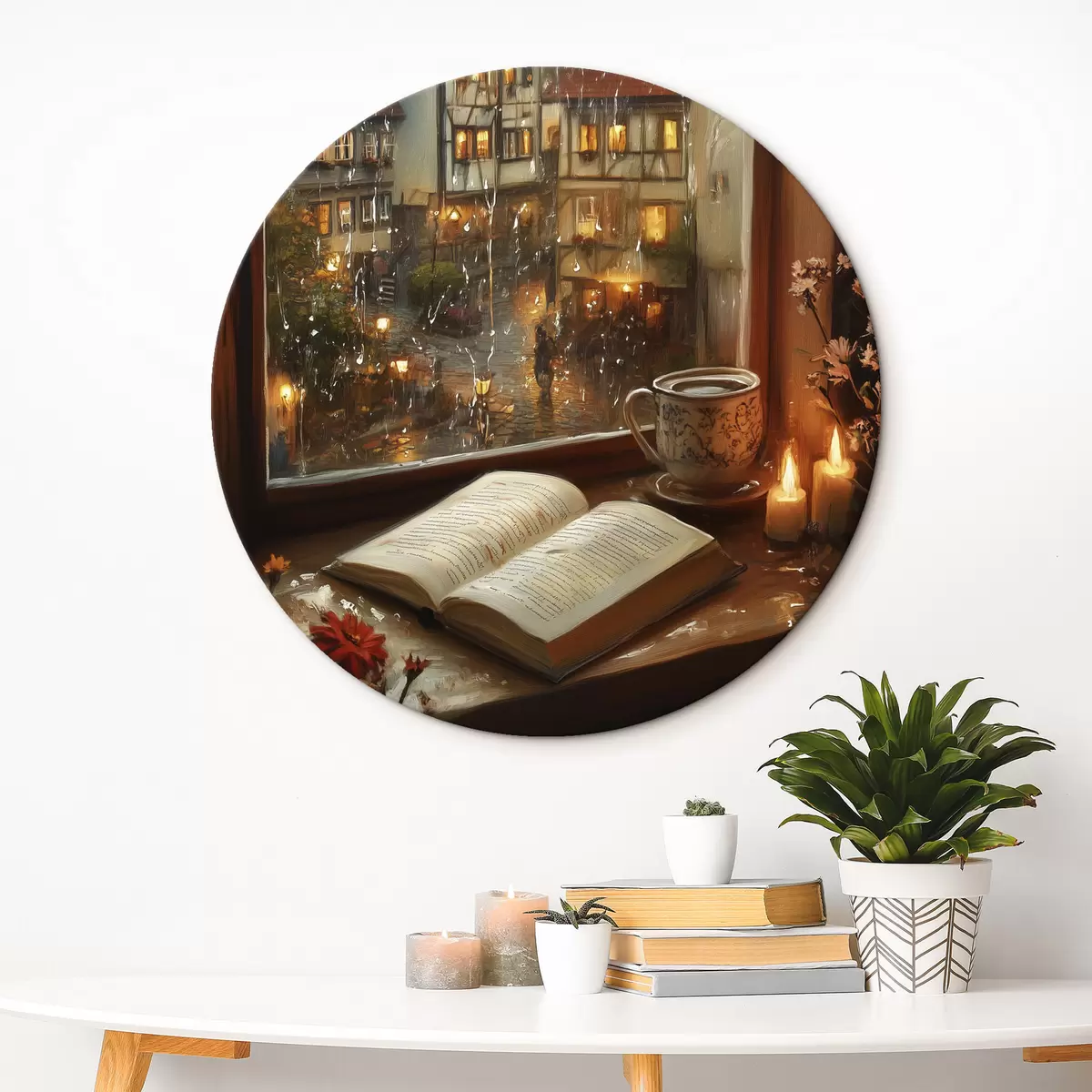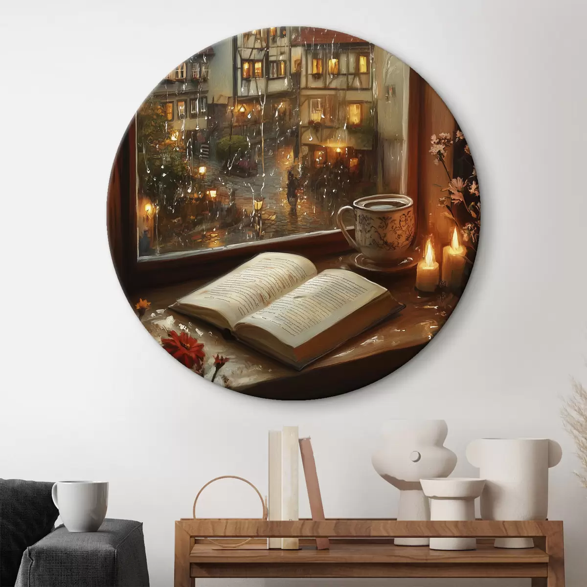 Quadri rotondi Libro sul davanzale della finestra, candele, giornata di pioggia, ambiente accogliente r44722
