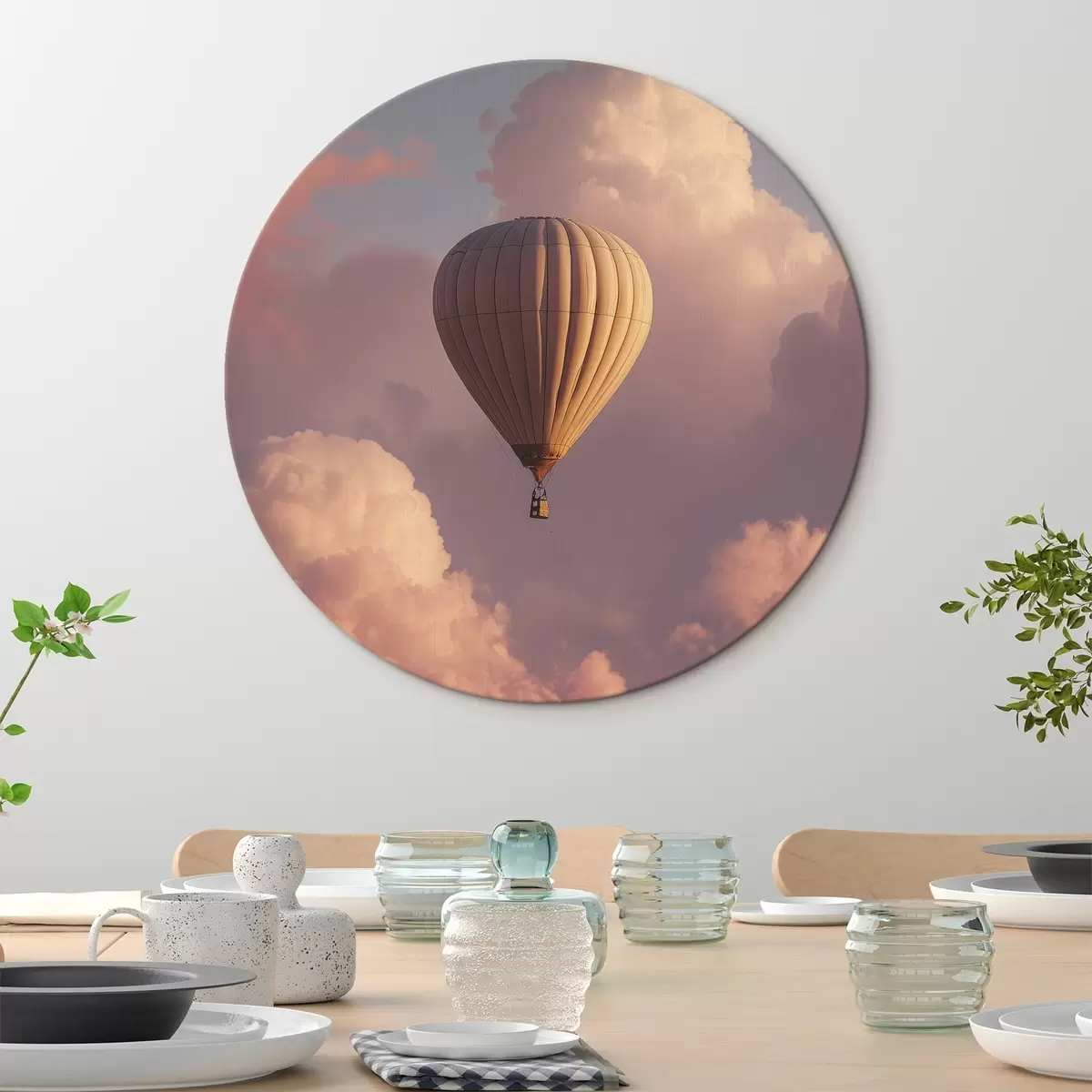 Quadri rotondi Mongolfiera nel cielo del tramonto con le nuvole r44790
