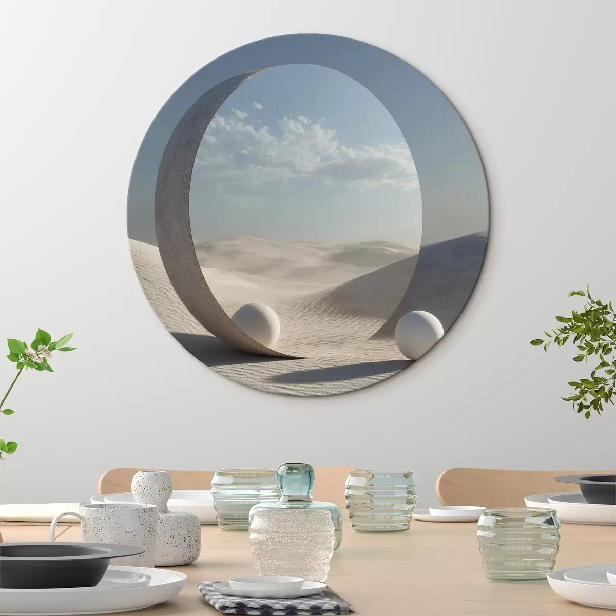 Quadri rotondi Surreale paesaggio desertico con uno specchio rotondo che riflette il cielo e la luna r44792