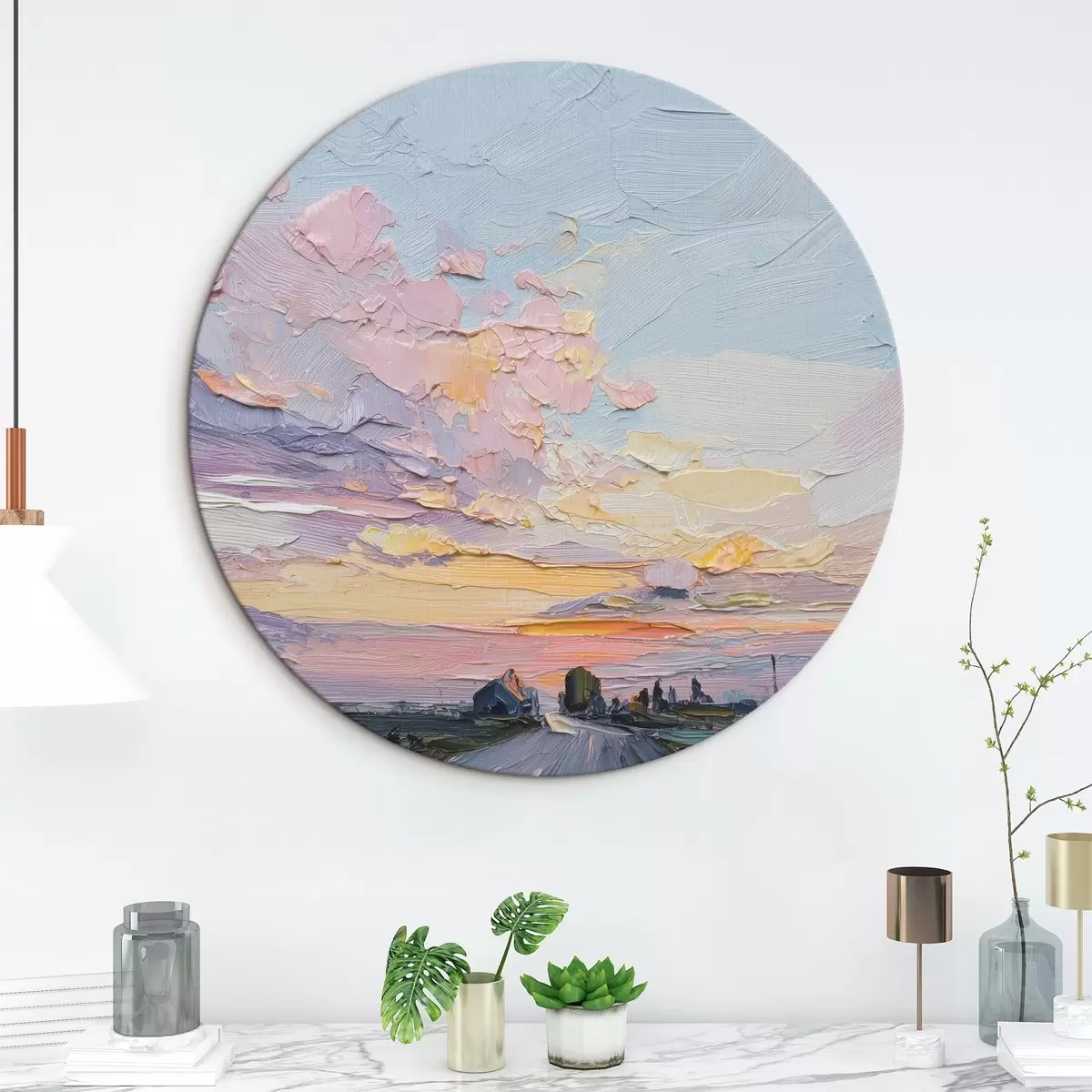 Quadri rotondi Paesaggi di campagna nel disegno in stile olio, tramonto r44794