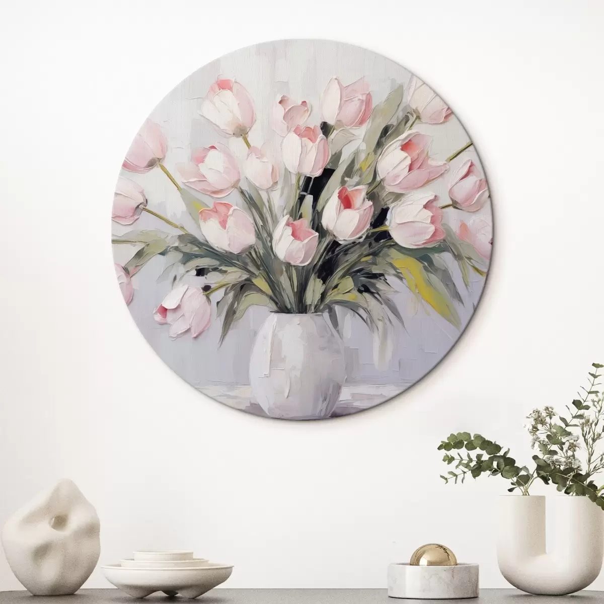 Quadri rotondi Vaso con tulipani rosa, foglie verdi, sfondo grigio chiaro, stile pittura ad olio, pennellate spesse r44852