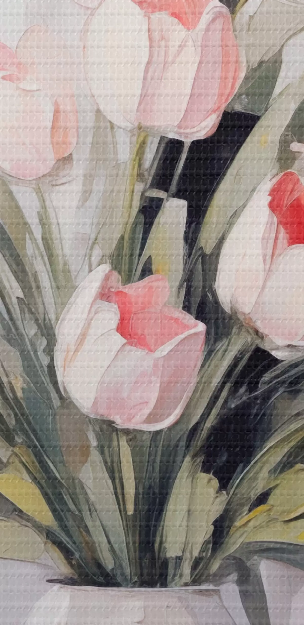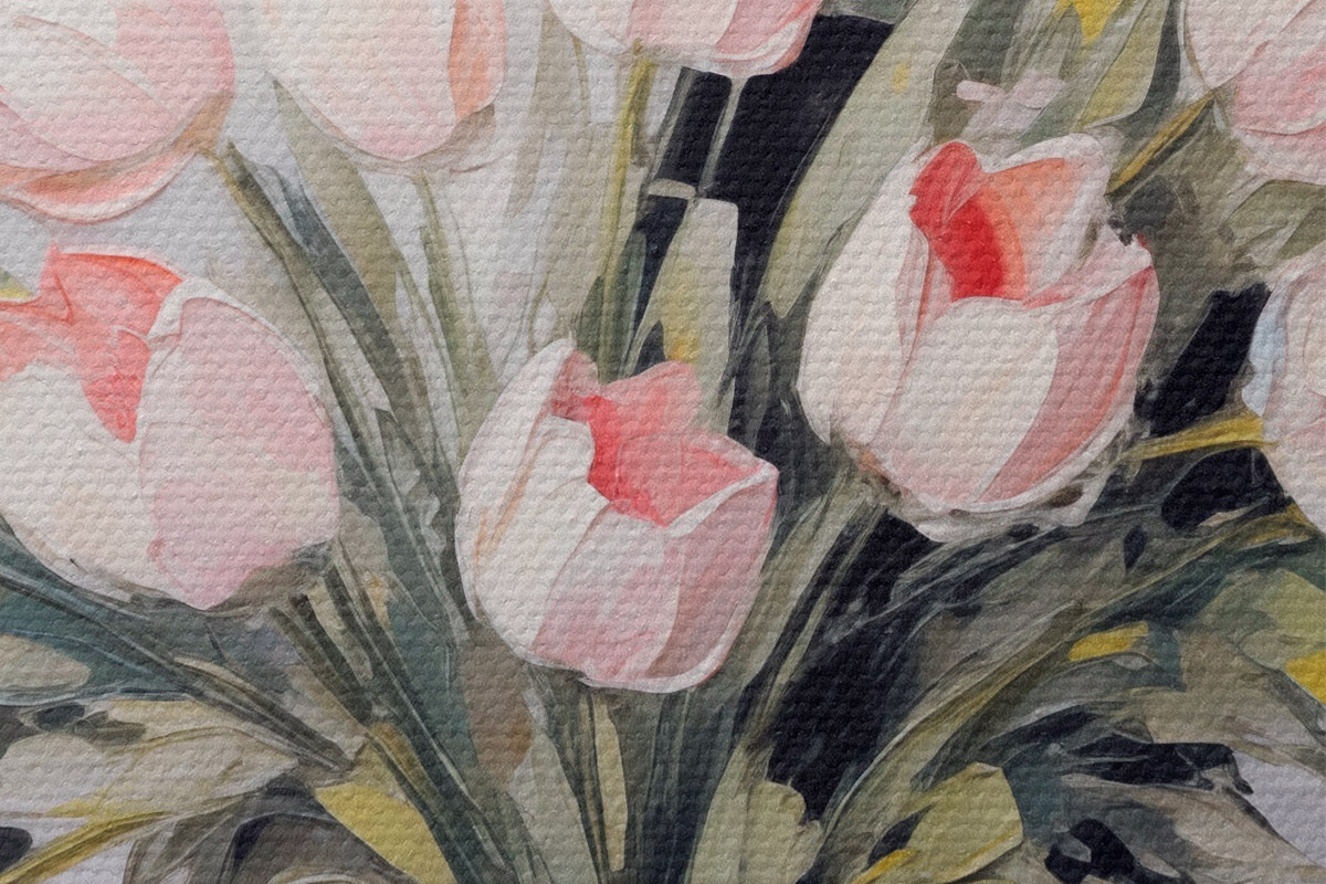 Immagine Vaso con tulipani rosa, foglie verdi, sfondo grigio chiaro, stile pittura ad olio, pennellate spesse Nr r44852