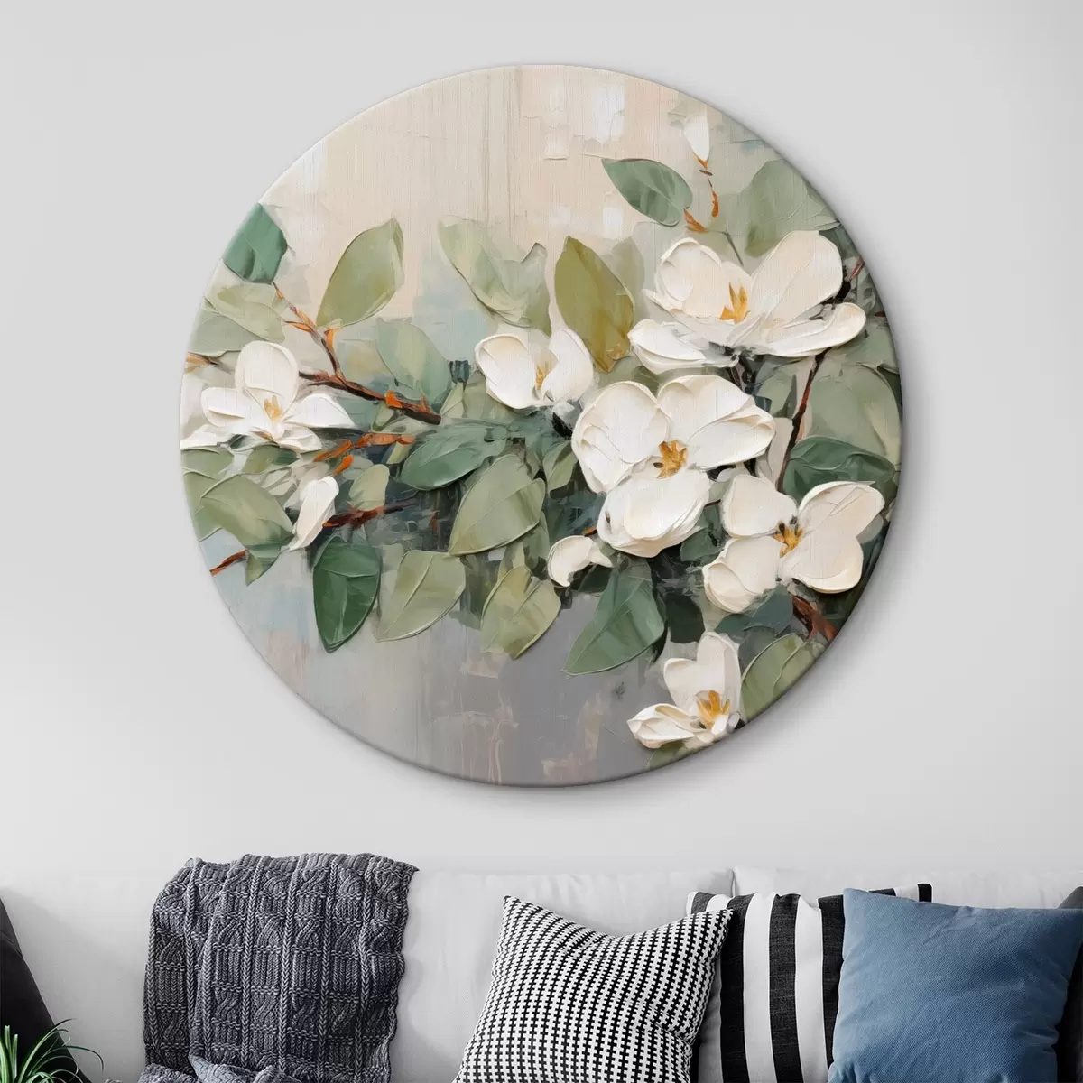 Quadri rotondi Fiori di magnolia con foglie verdi su un ramo, stile impasto testurizzato, tavolozza di colori tenui r44853