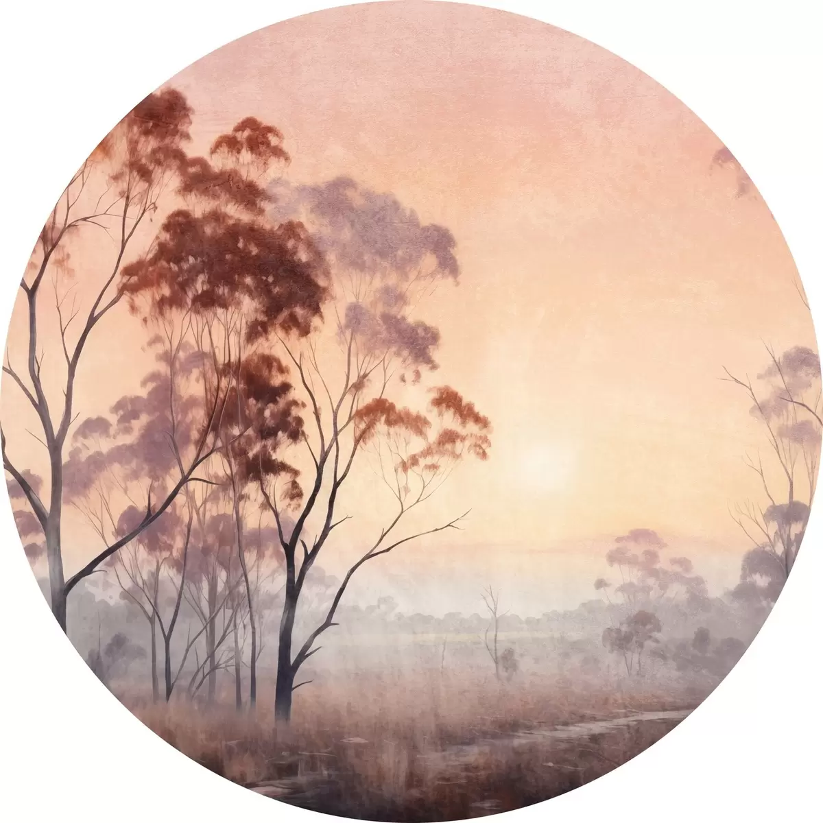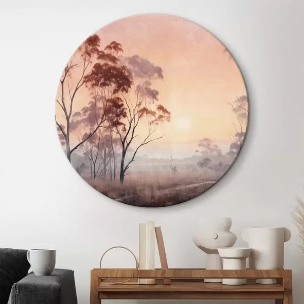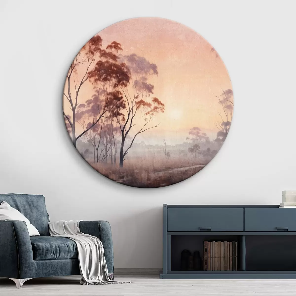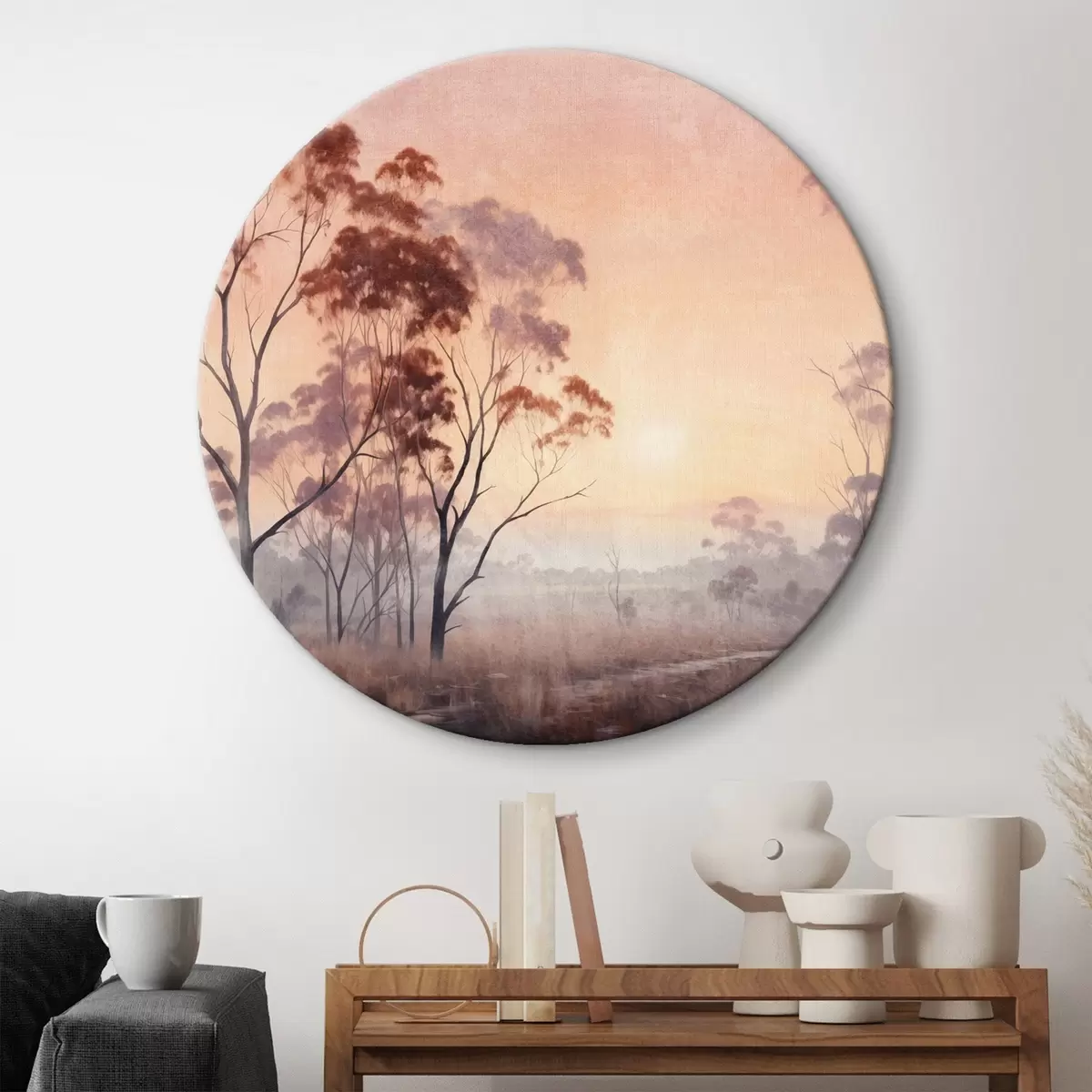 Quadri rotondi Un dipinto di paesaggio di un campo con erba alta e alberi, il sole sullo sfondo r44854
