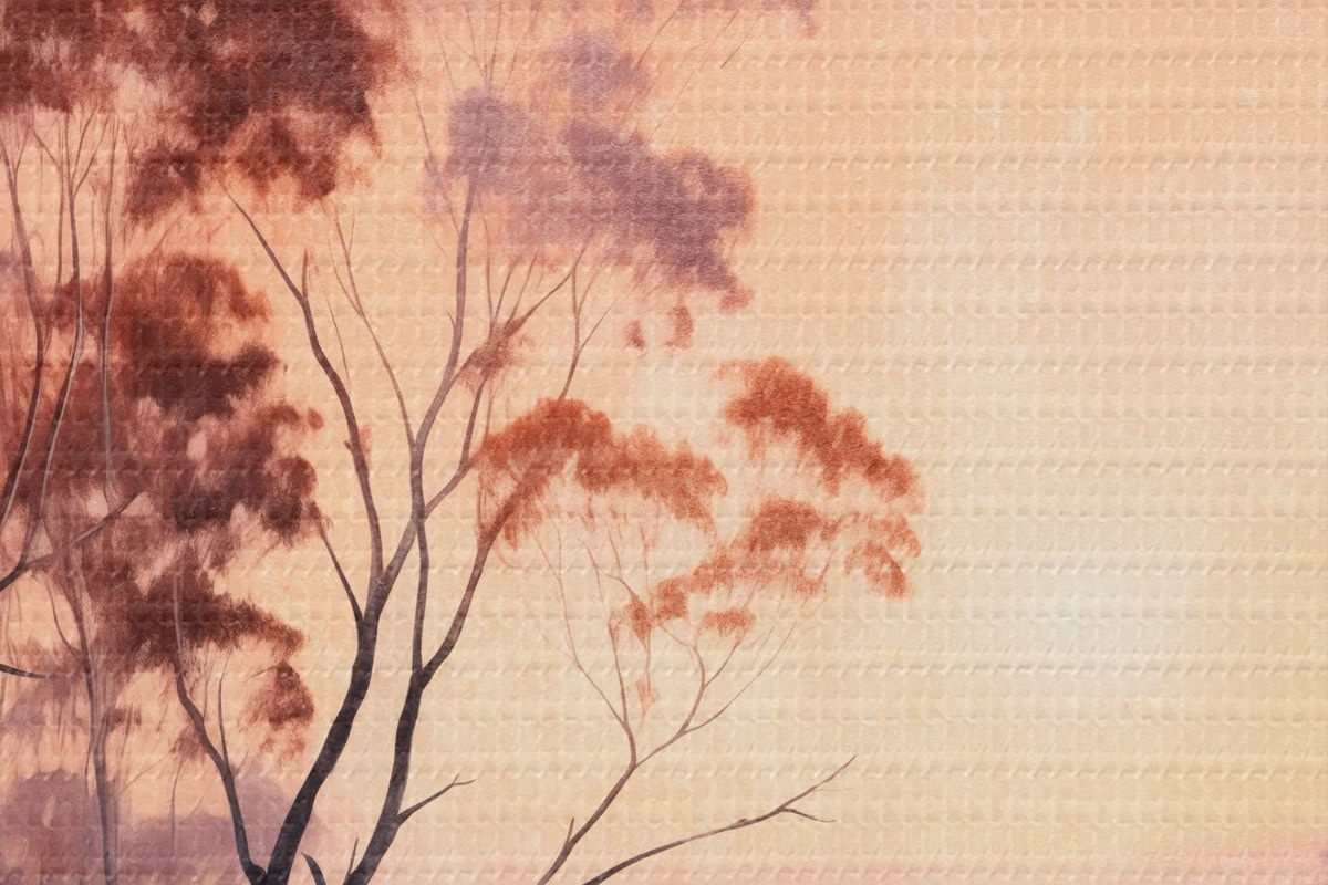 Immagine Un dipinto di paesaggio di un campo con erba alta e alberi, il sole sullo sfondo Nr r44854