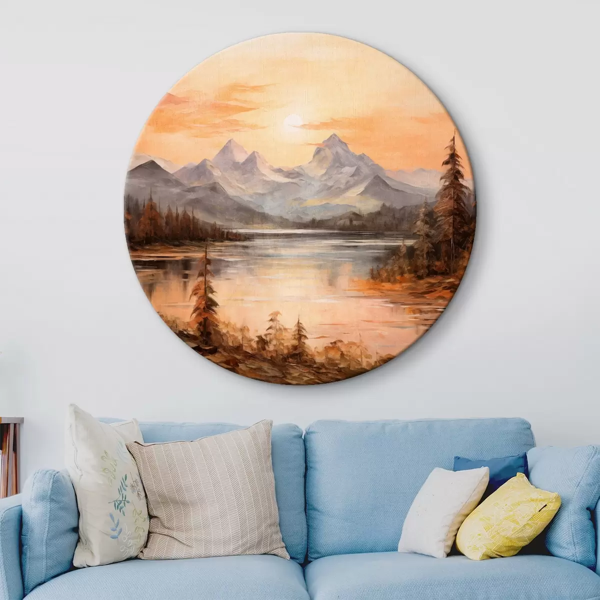 Quadri rotondi Paesaggio con un lago circondato da alberi e montagne sullo sfondo, cielo arancione con il sole r44857