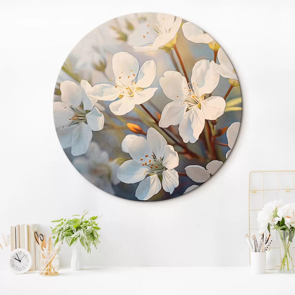 Quadri rotondi Fiori di ciliegio bianchi strutturati in stile acquerello, petali delicati, stagione primaverile r44859
