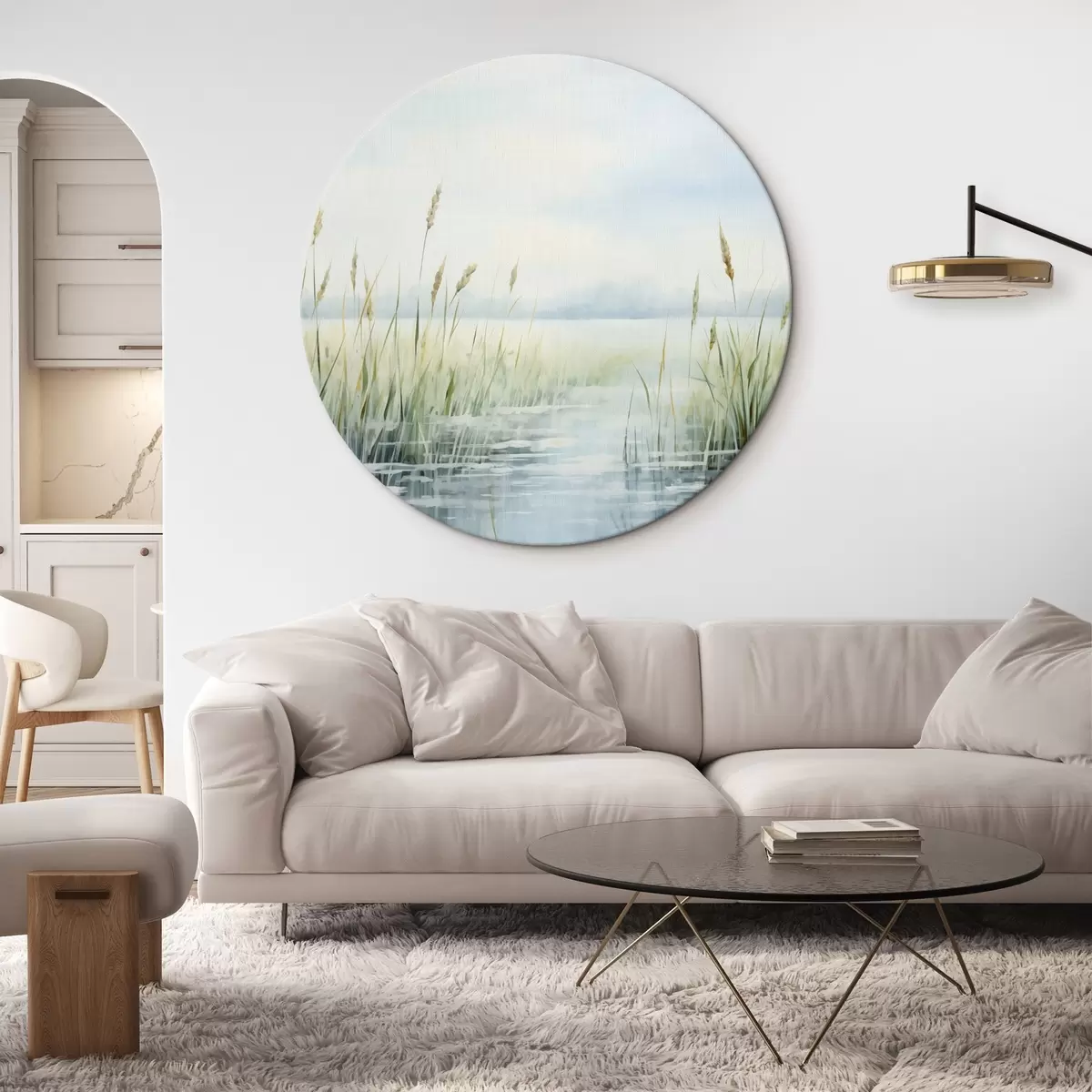 Quadri rotondi Una pittura ad acquerello imitazione di erba alta che cresce vicino all'acqua, cielo coperto e sfondo sfocato r44860