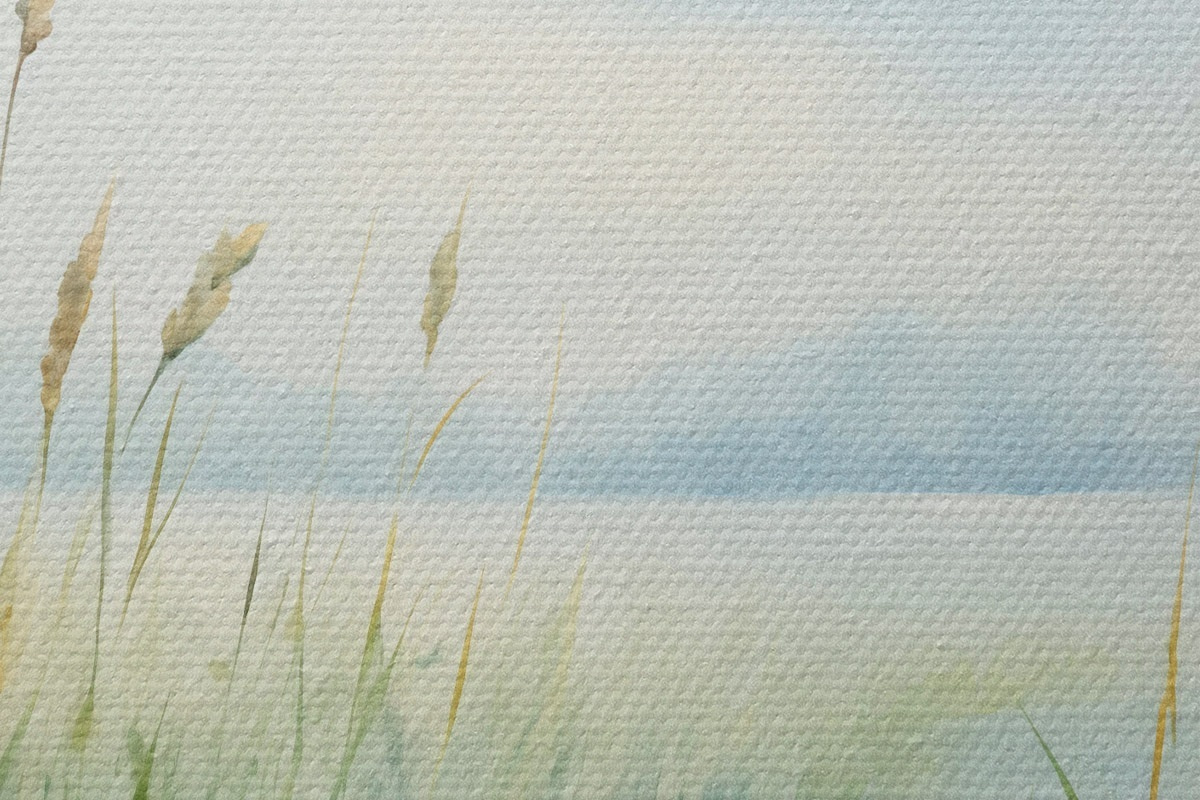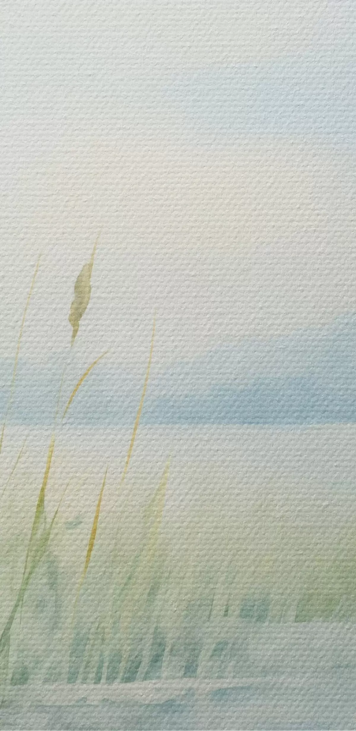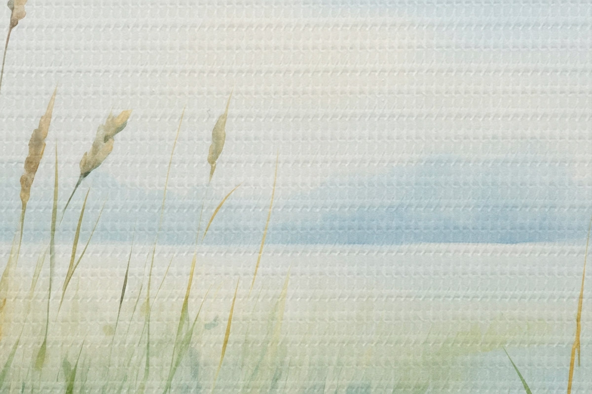 Immagine Una pittura ad acquerello imitazione di erba alta che cresce vicino all'acqua, cielo coperto e sfondo sfocato Nr r44860