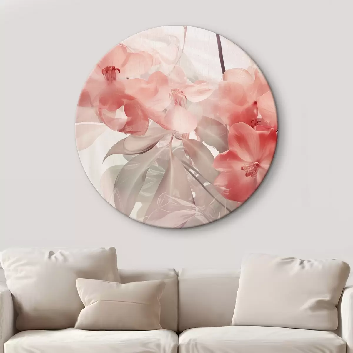 Quadri rotondi Fiori tropicali rosa vibranti con foglie verdi tenui, che creano una texture delicata e sognante r44861