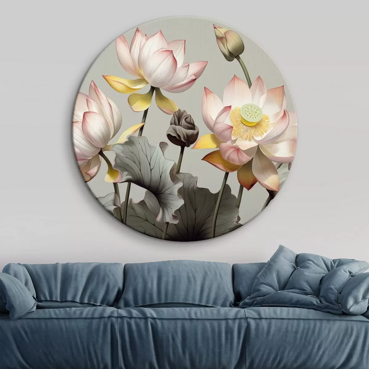 Quadri rotondi Fiori di loto con petali pastello e foglie verdi, in una tavolozza di colori tenui, su uno sfondo semplice r44862