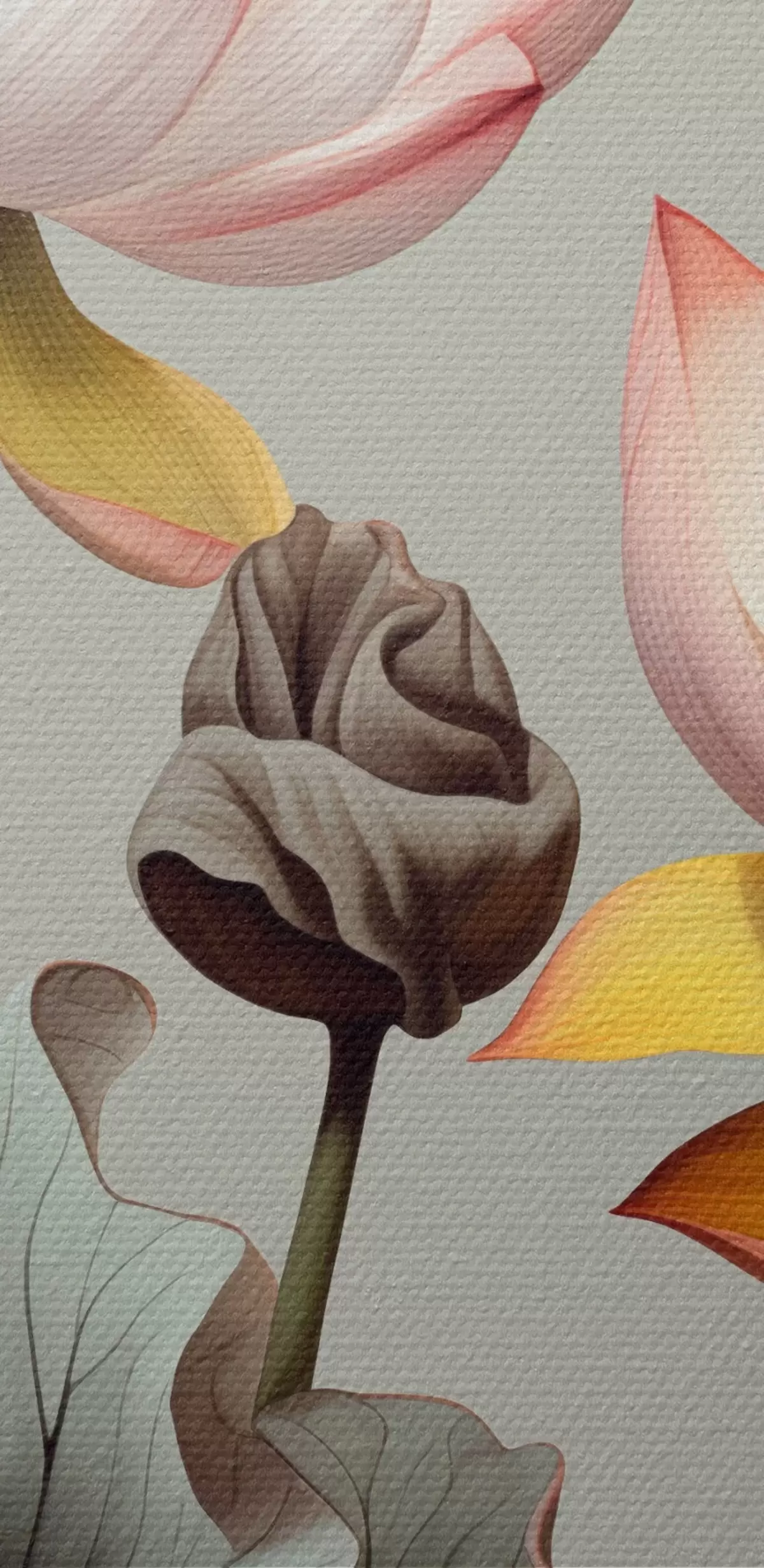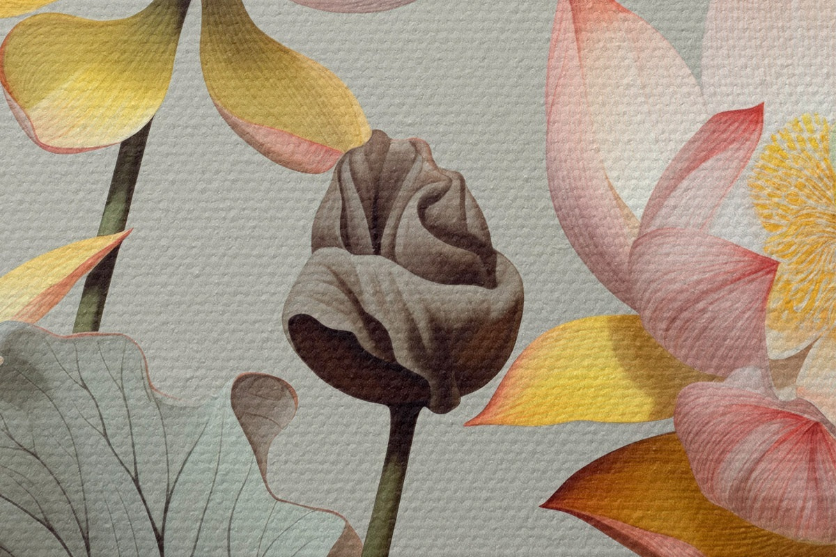Immagine Fiori di loto con petali pastello e foglie verdi, in una tavolozza di colori tenui, su uno sfondo semplice Nr r44862