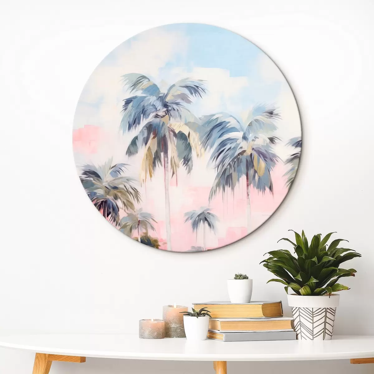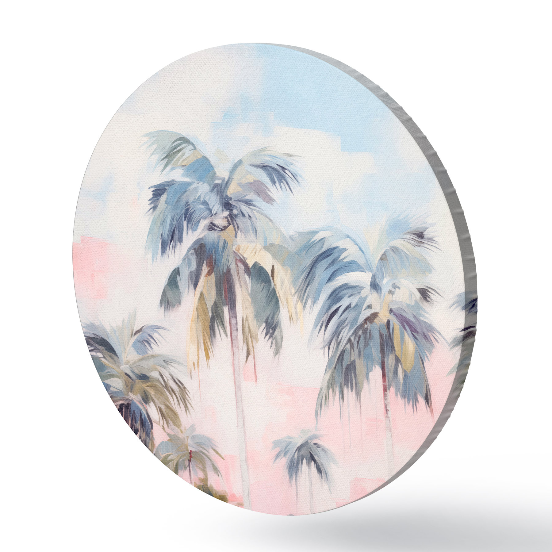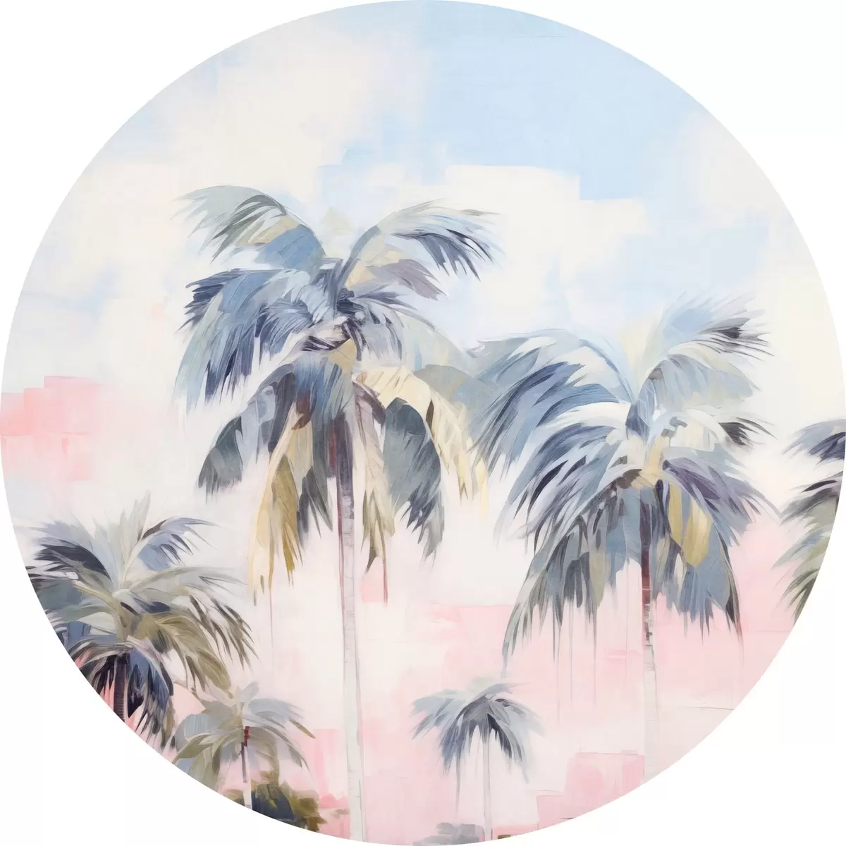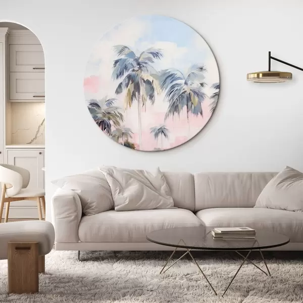 Quadri rotondi Palme con foglie color pastello e tronchi marroni, cielo rosa e azzurro, ambiente tropicale r44866