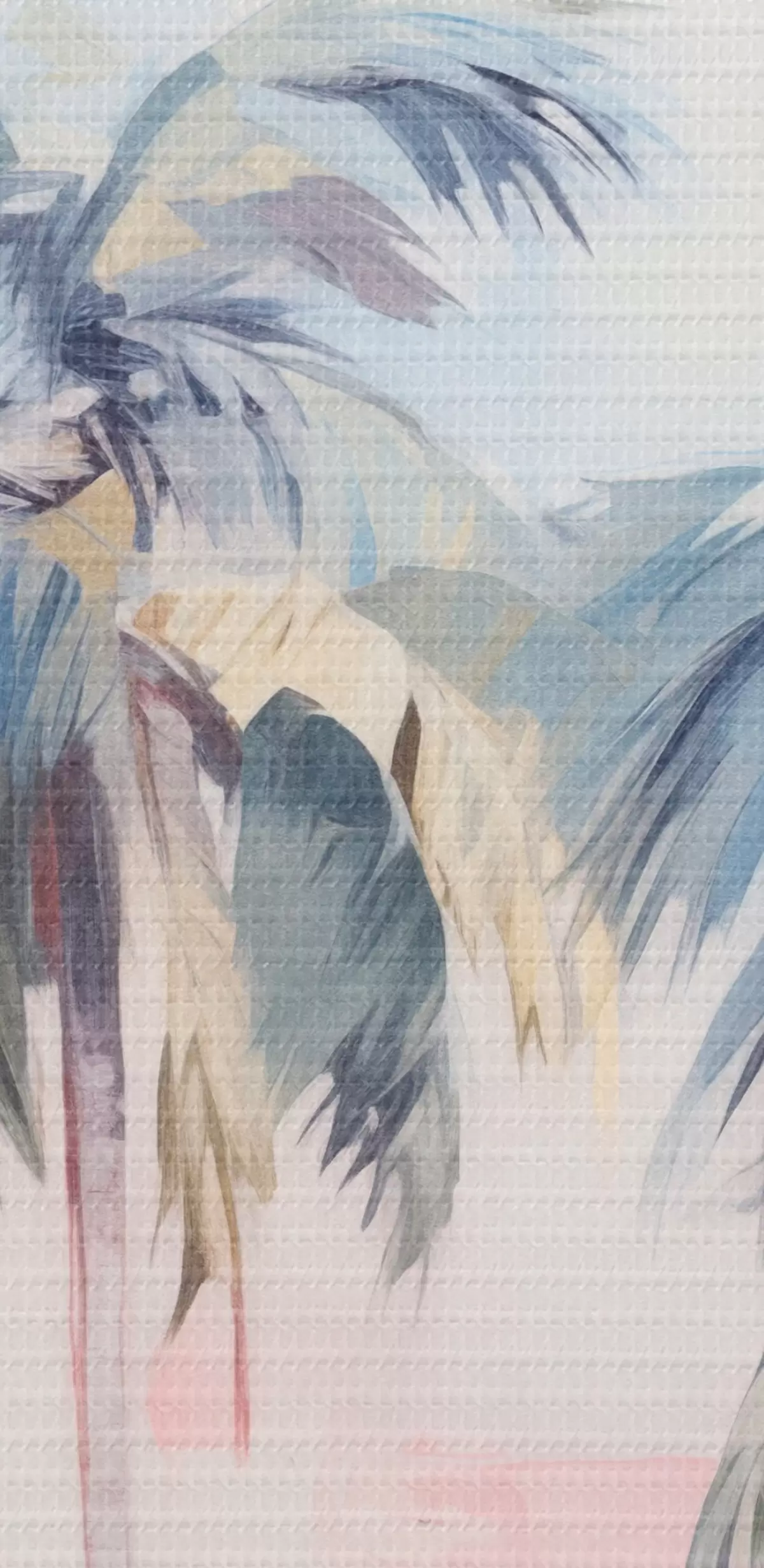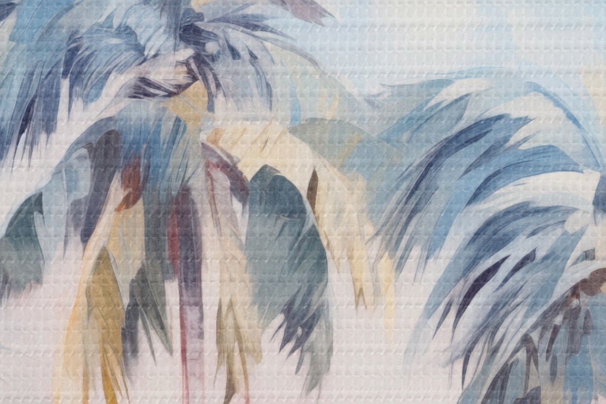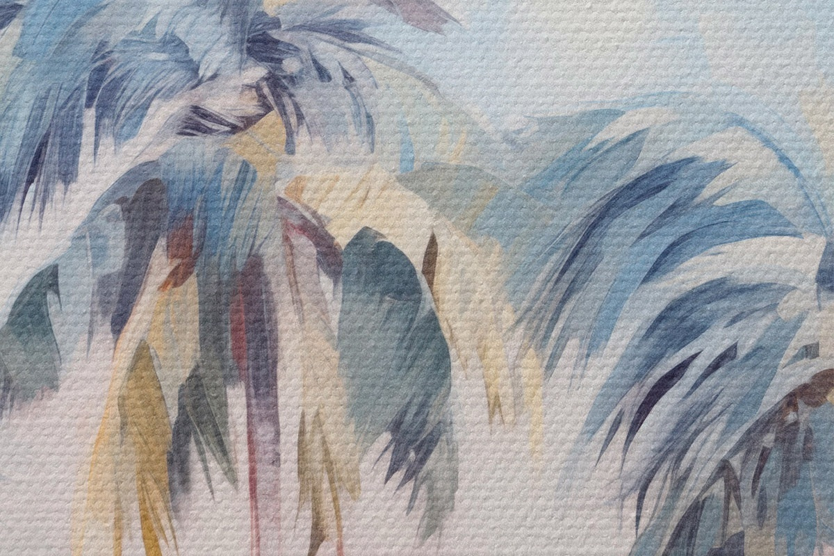 Immagine Palme con foglie color pastello e tronchi marroni, cielo rosa e azzurro, ambiente tropicale Nr r44866