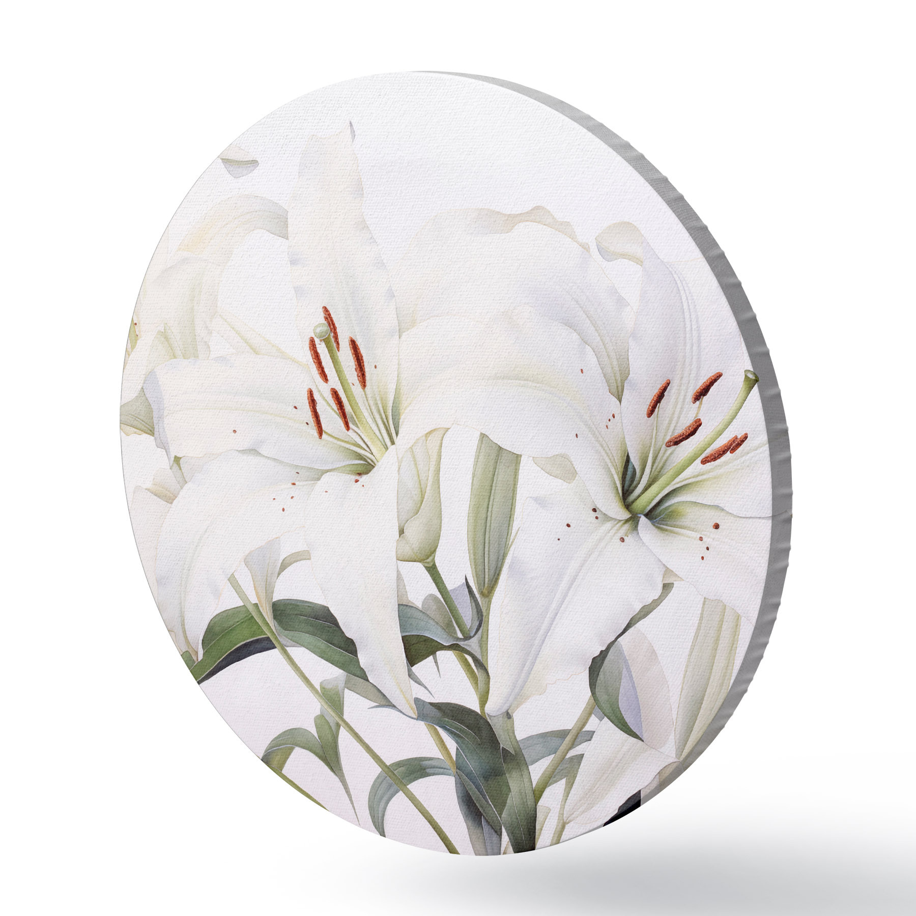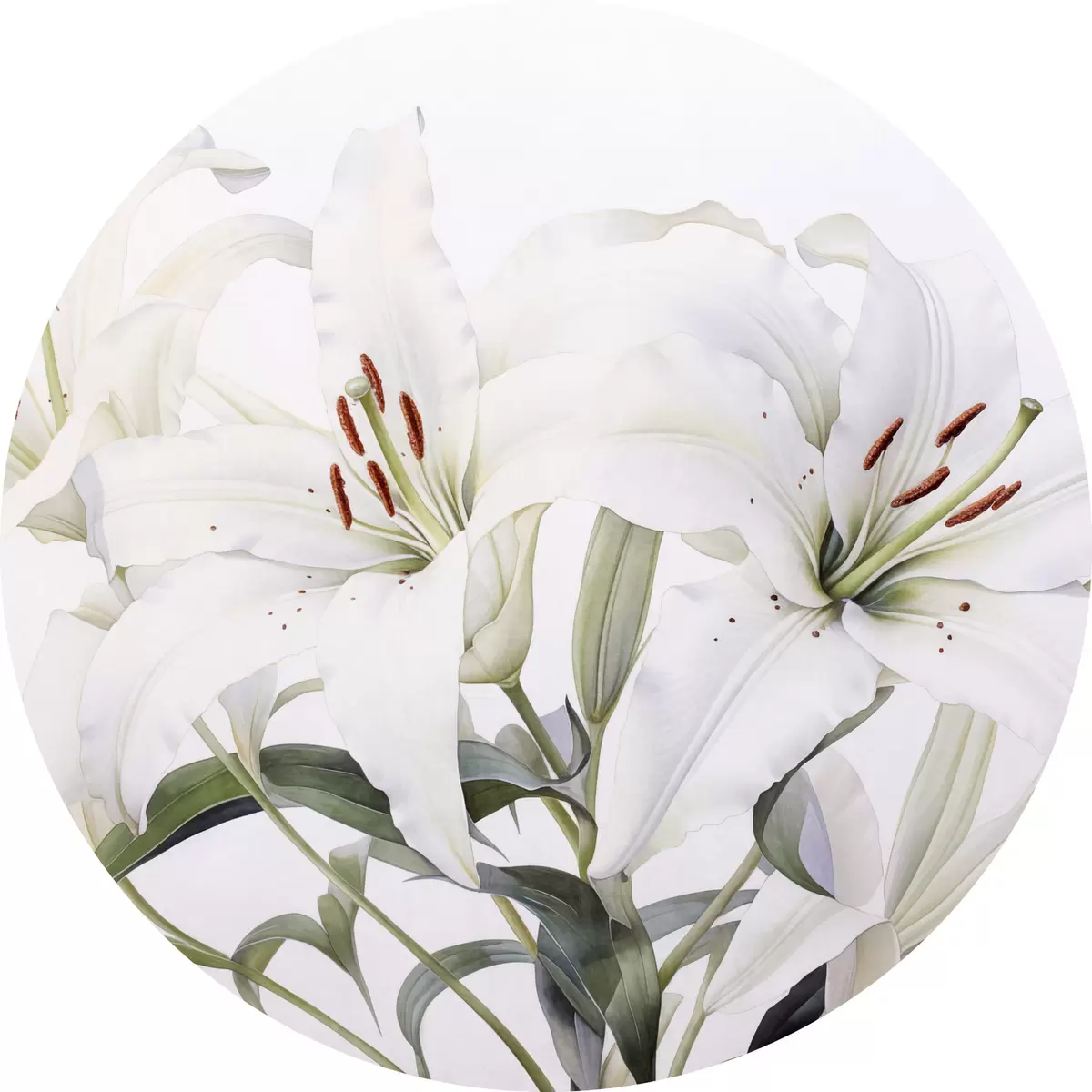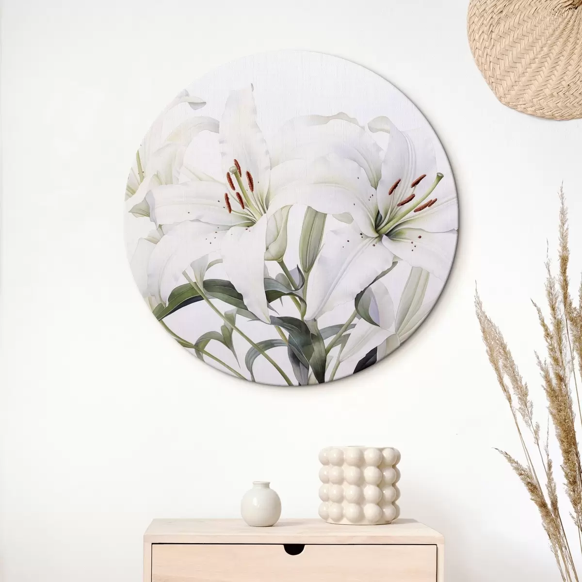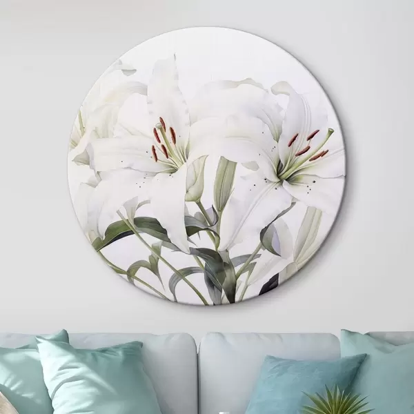 Quadri rotondi Un bouquet di gigli bianchi con foglie verdi, petali delicati e un morbido sfondo bianco r44868
