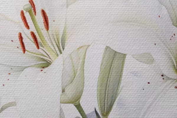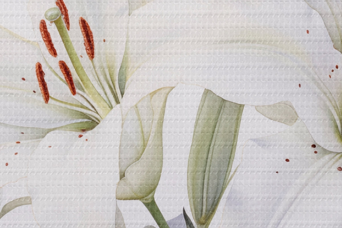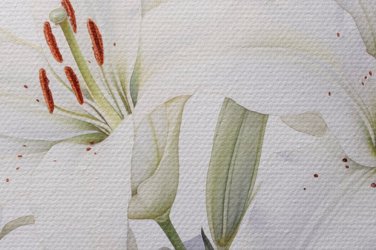 Immagine Un bouquet di gigli bianchi con foglie verdi, petali delicati e un morbido sfondo bianco Nr r44868