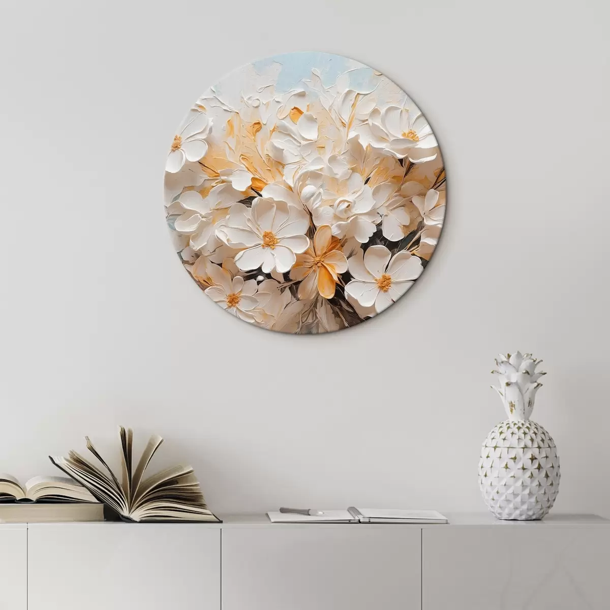 Quadri rotondi Fiori bianchi e pesca su sfondo blu con colori pastello r44879