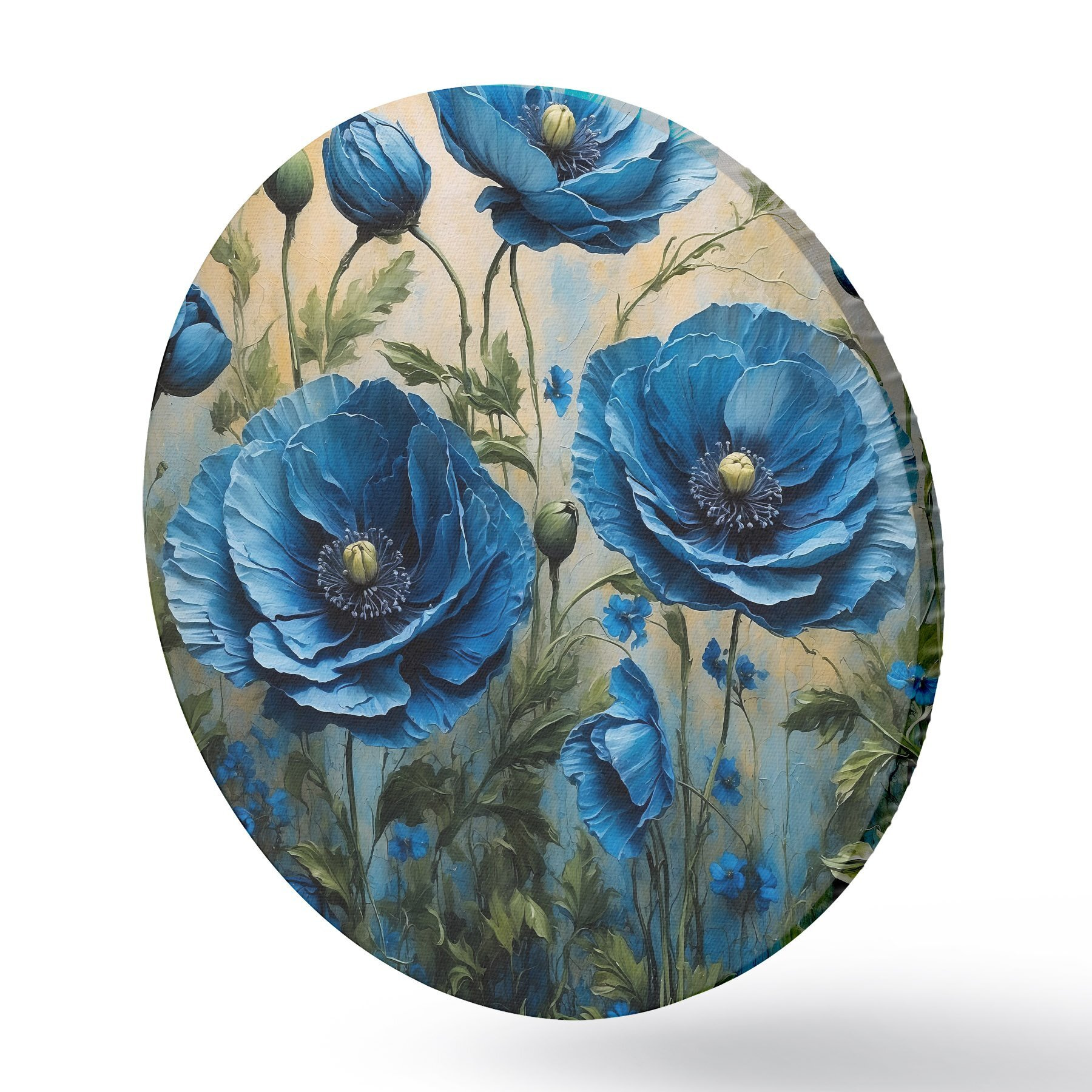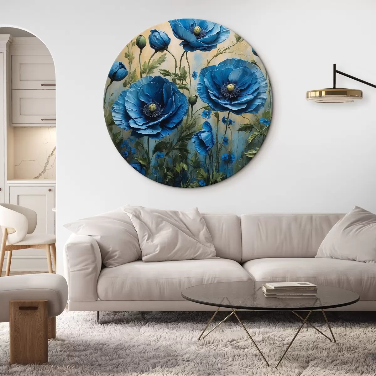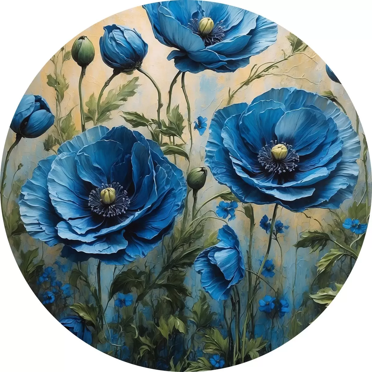 Quadri rotondi Papaveri blu su sfondo pastello con foglie r44882