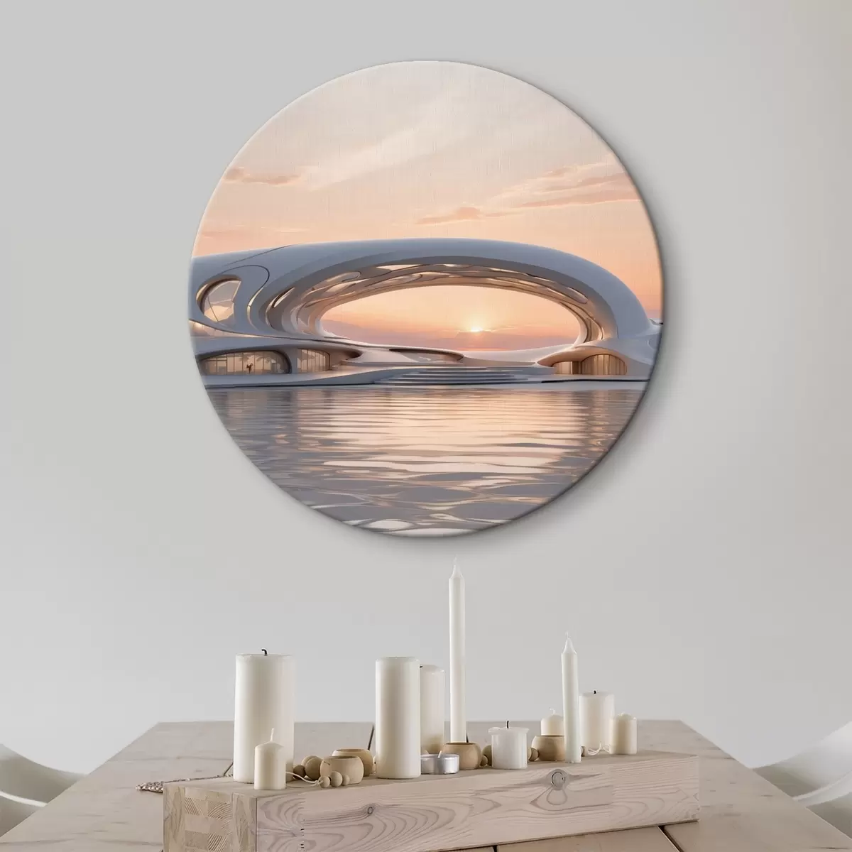 Quadri rotondi Edificio futuristico sull'acqua contro un tramonto rosa r44884