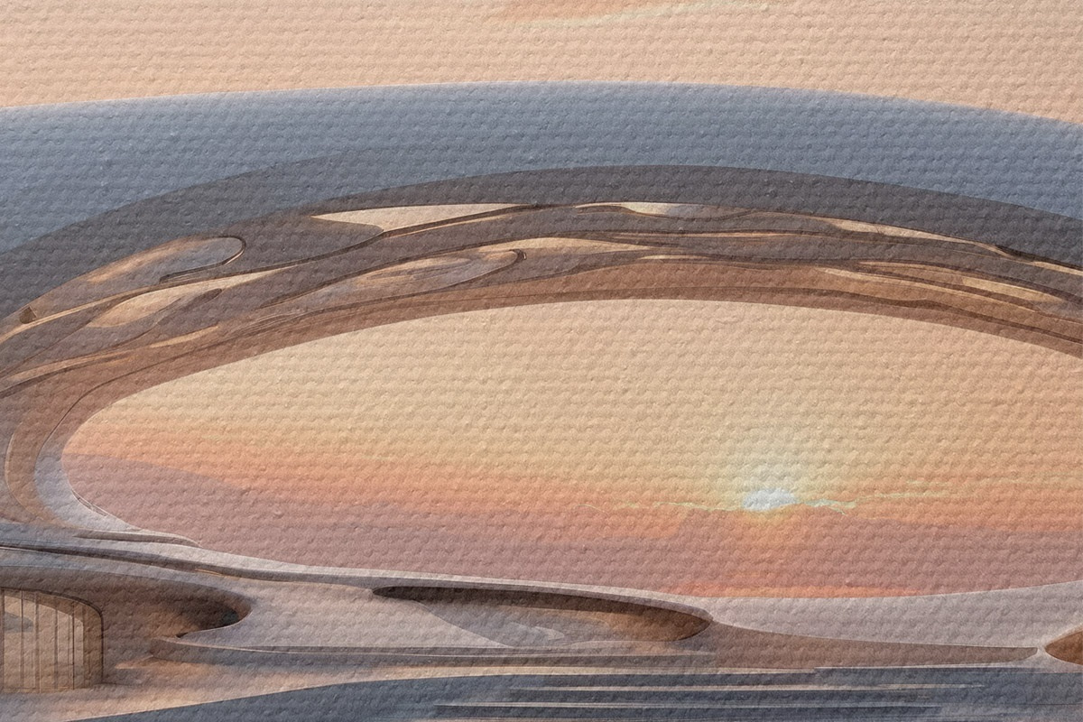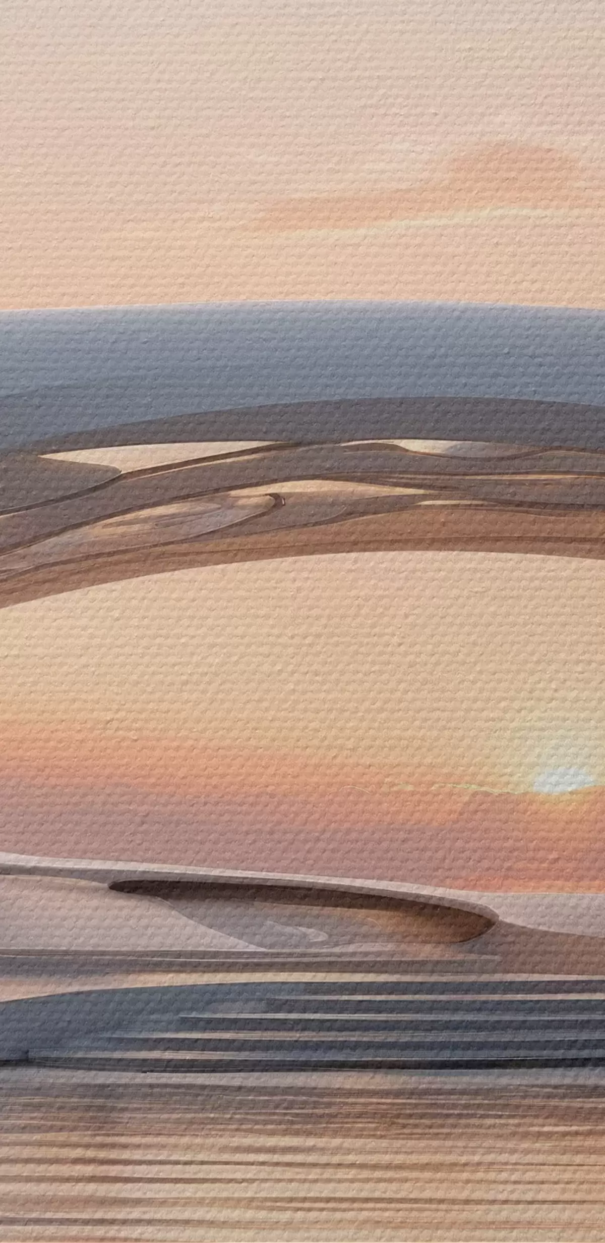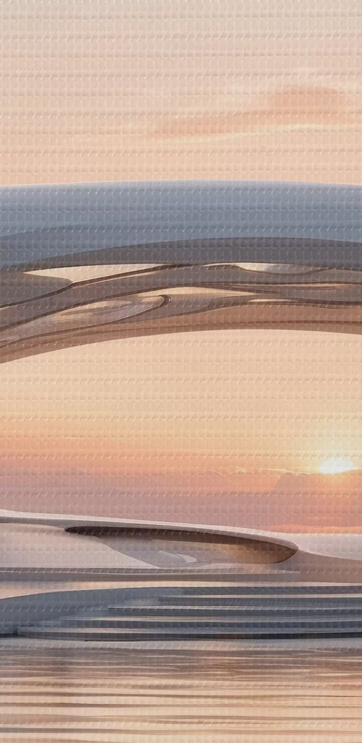 Immagine Edificio futuristico sull'acqua contro un tramonto rosa Nr r44884